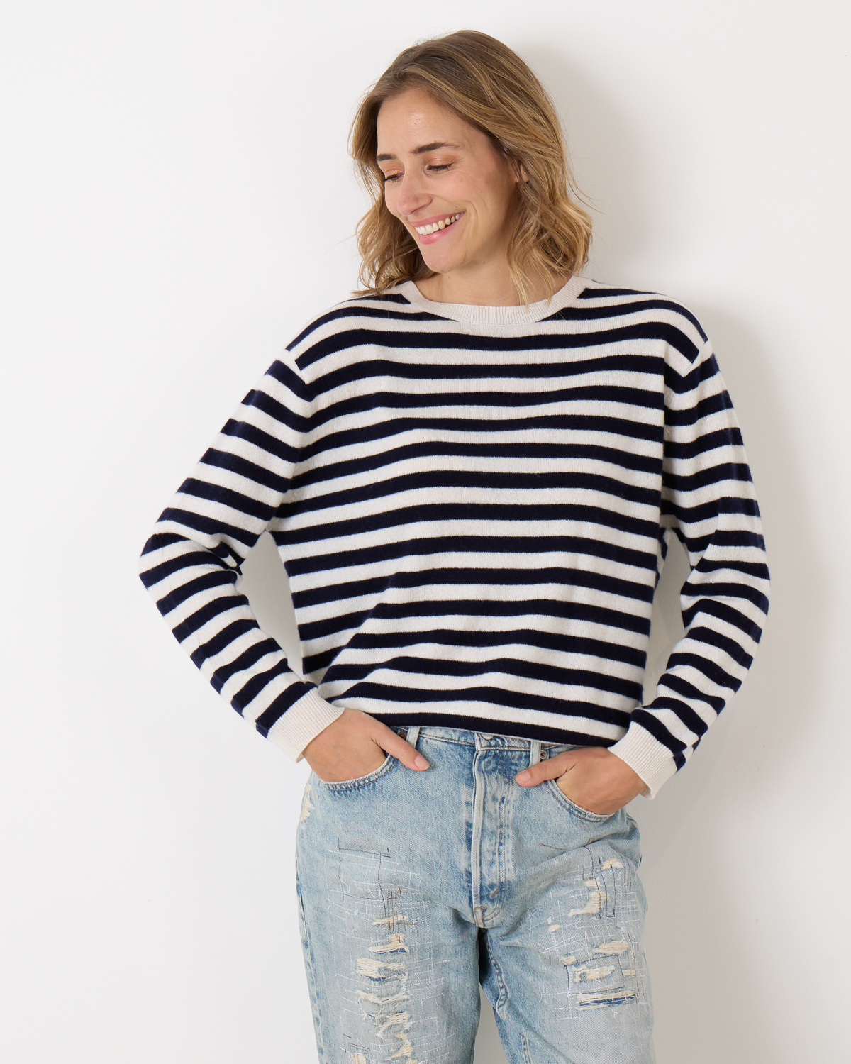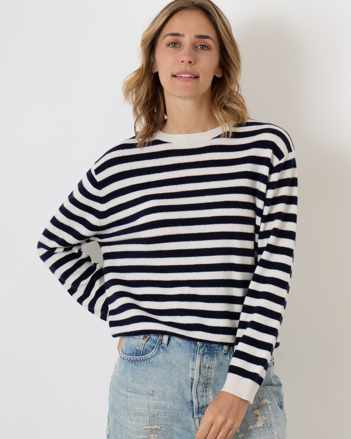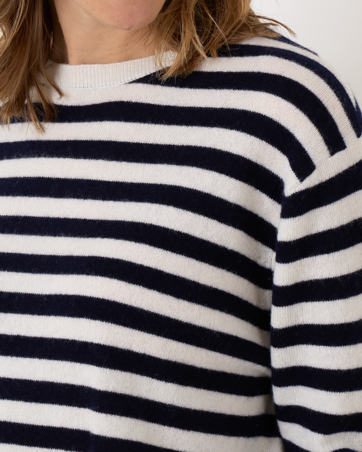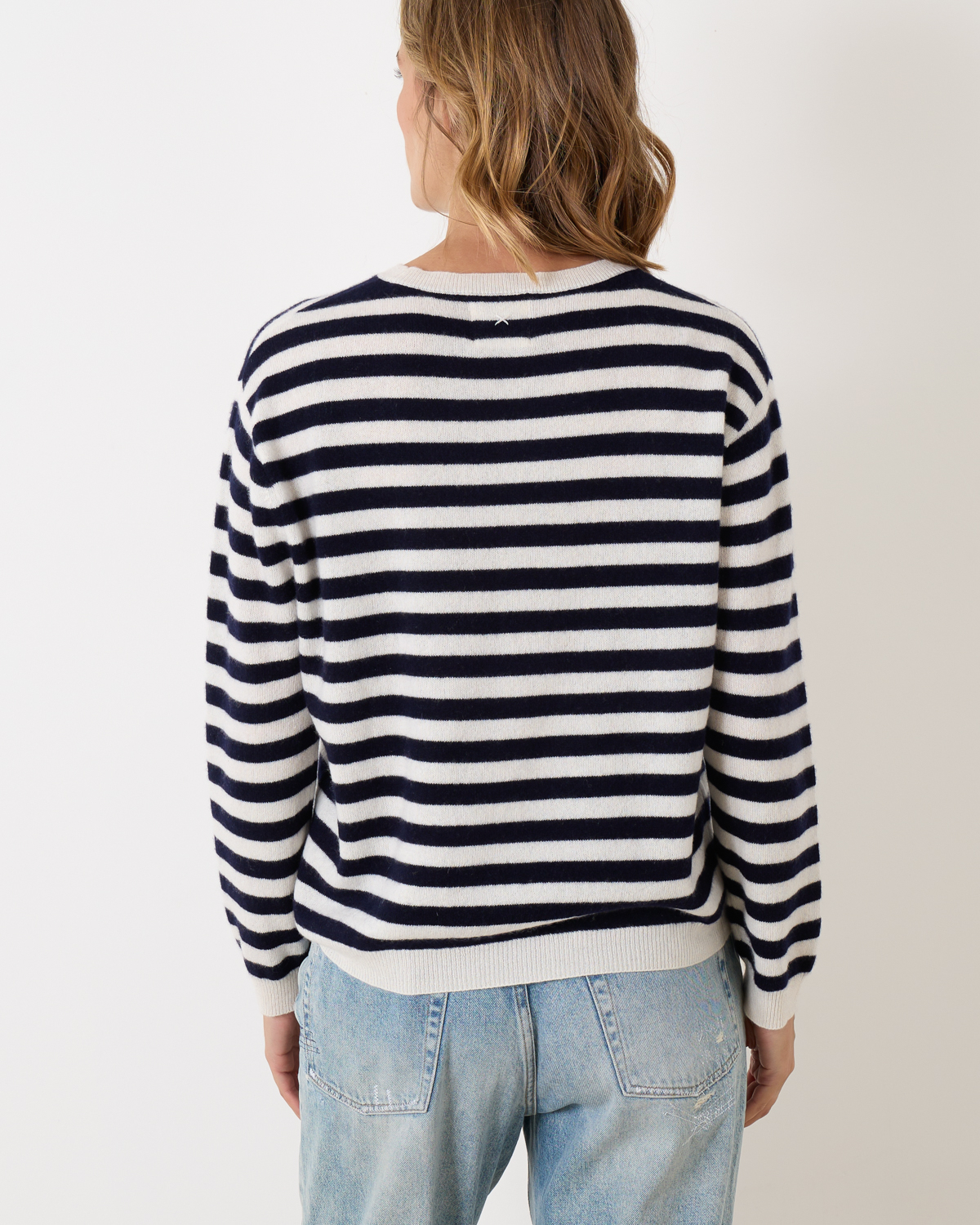 Cashmere pullover van het merk People's Republic of Cashmere in de kleur cloud/navy. Deze pullover heeft een ronde hals, lange mouwen en een boxy pasvorm. De pullover heeft een strak breisel wat er voor zorgt dat de Pilling tot een minimum wordt beperkt.