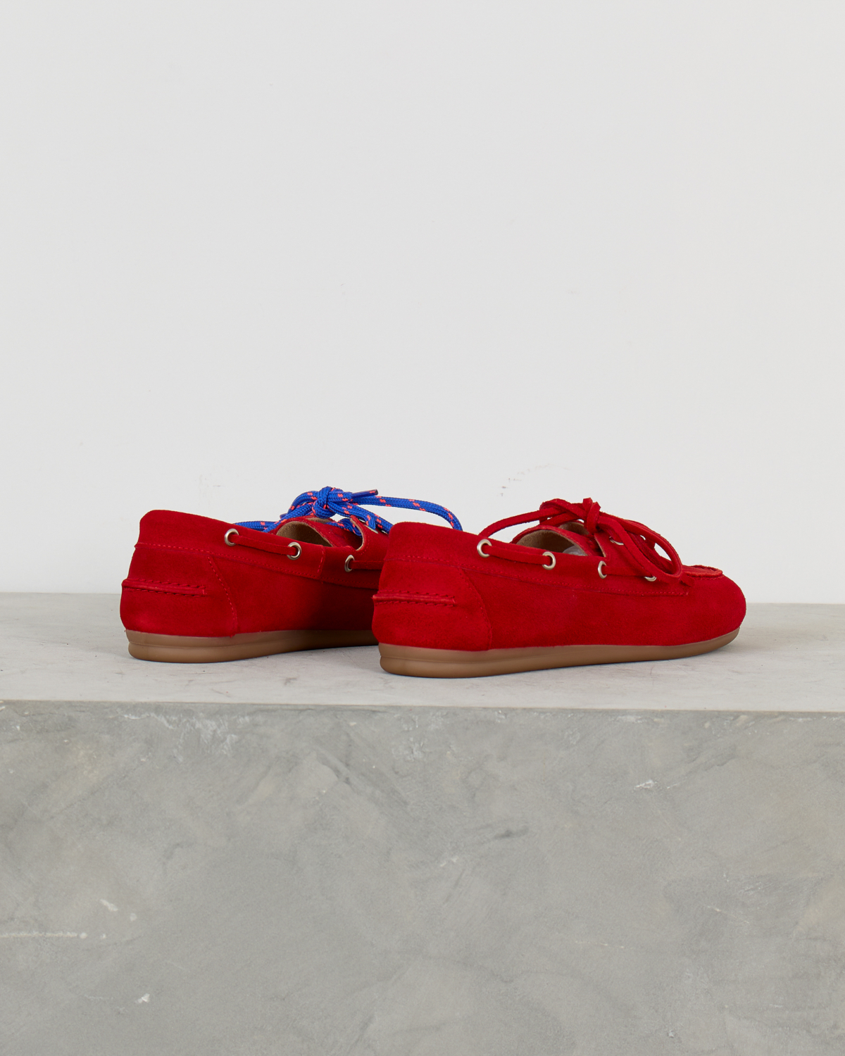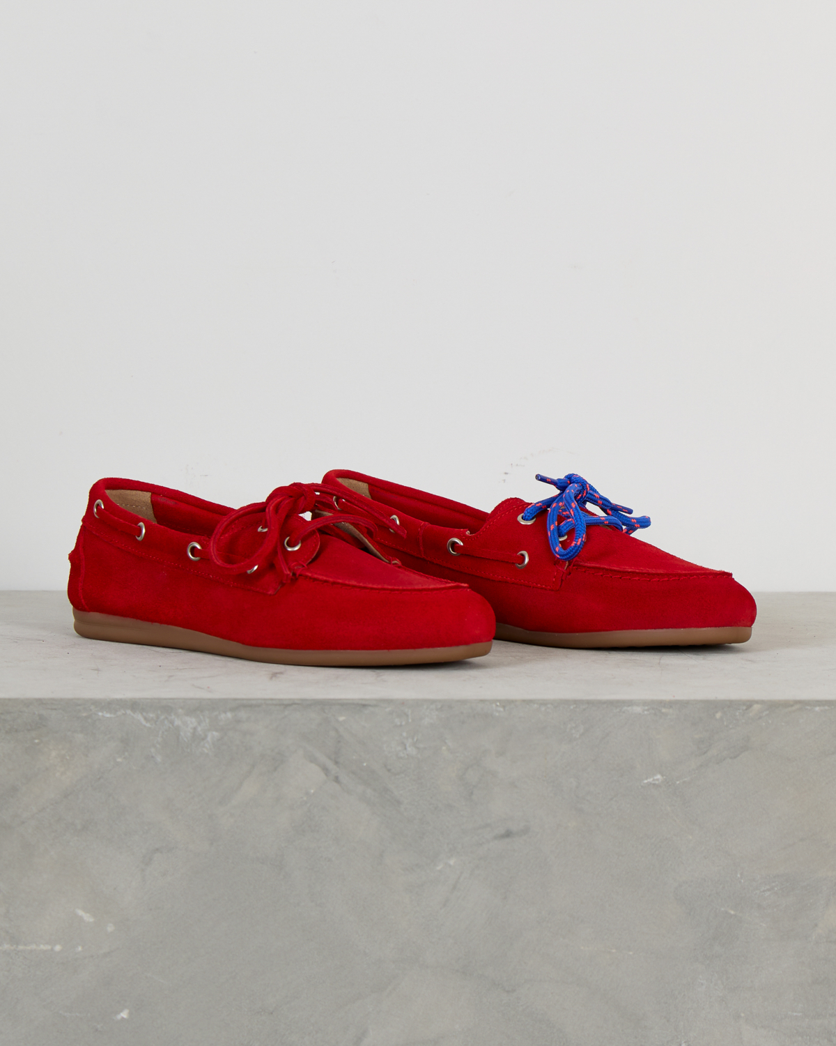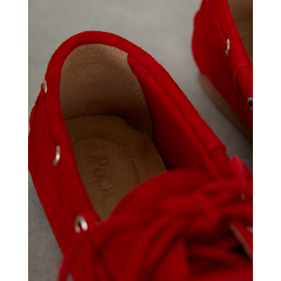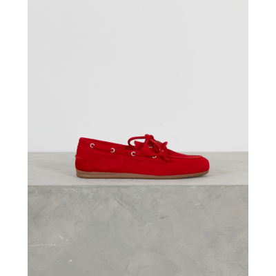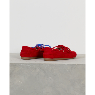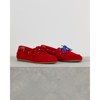 Deze opvallende rode suède loafer combineert klassieke bootschoen details met moderne flair. Het zachte suède materiaal voelt comfortabel aan en de karakteristieke vetersluiting met metalen oogjes geeft de schoen zijn authentieke boat shoe karakter. De lage, flexibele rubberen zool zorgt voor comfort tijdens het lopen. Het tijdloze silhouet krijgt een eigentijdse twist door de intense rode kleur.