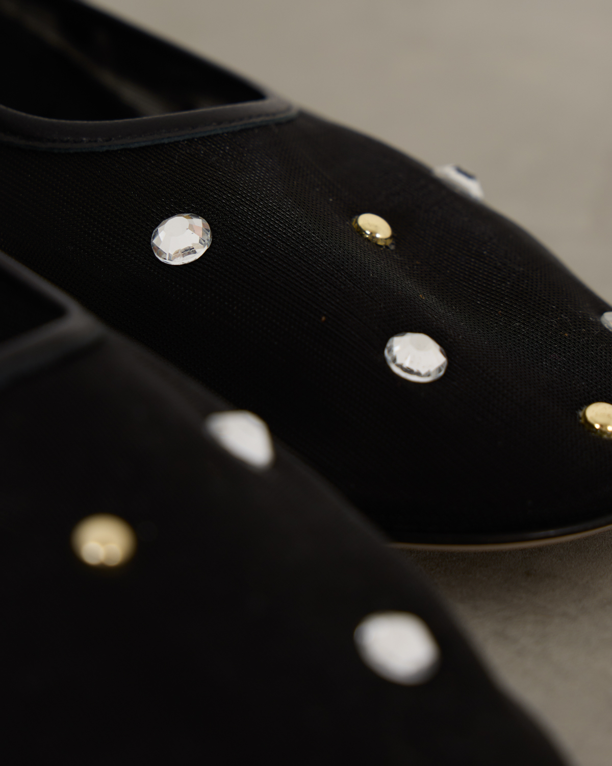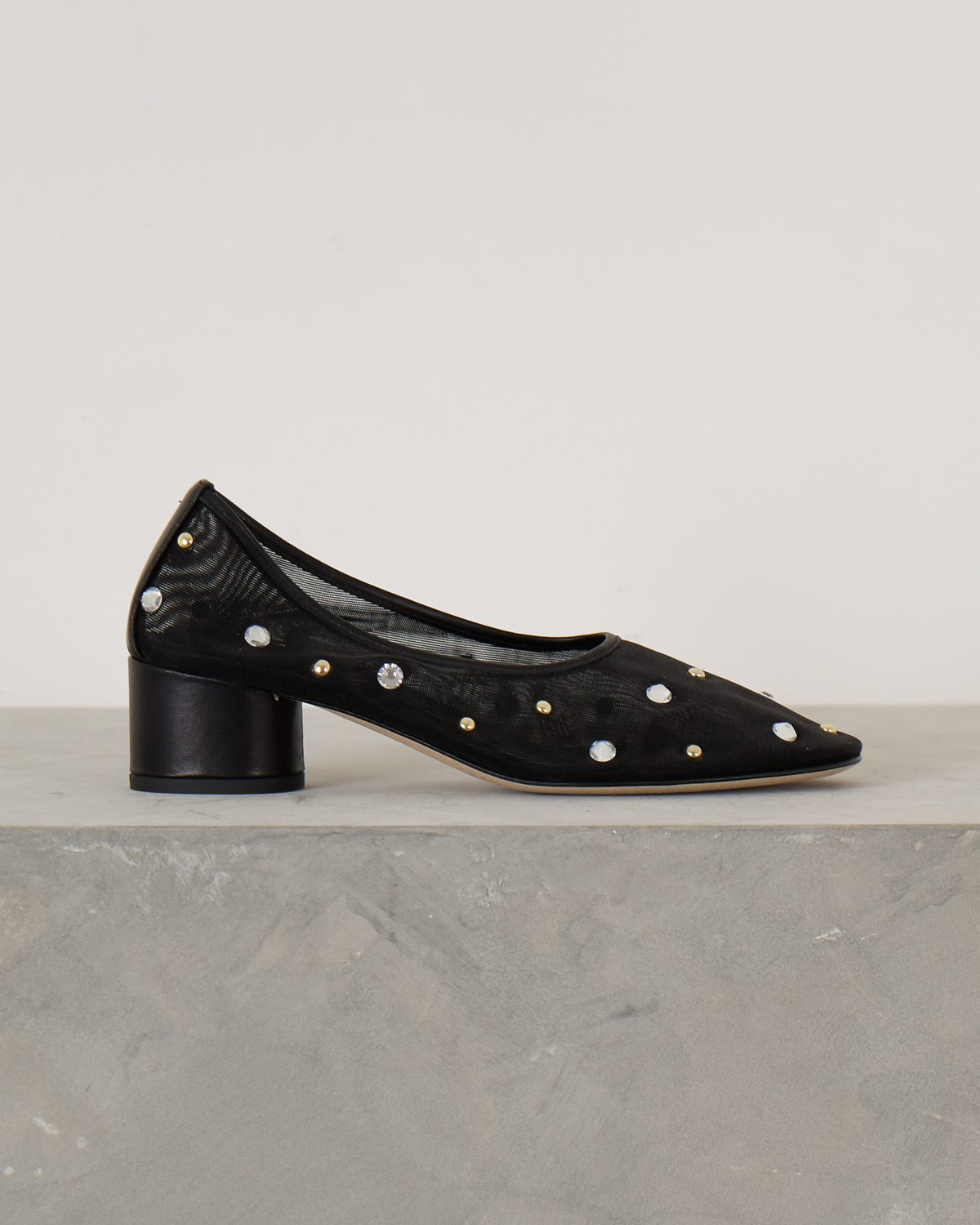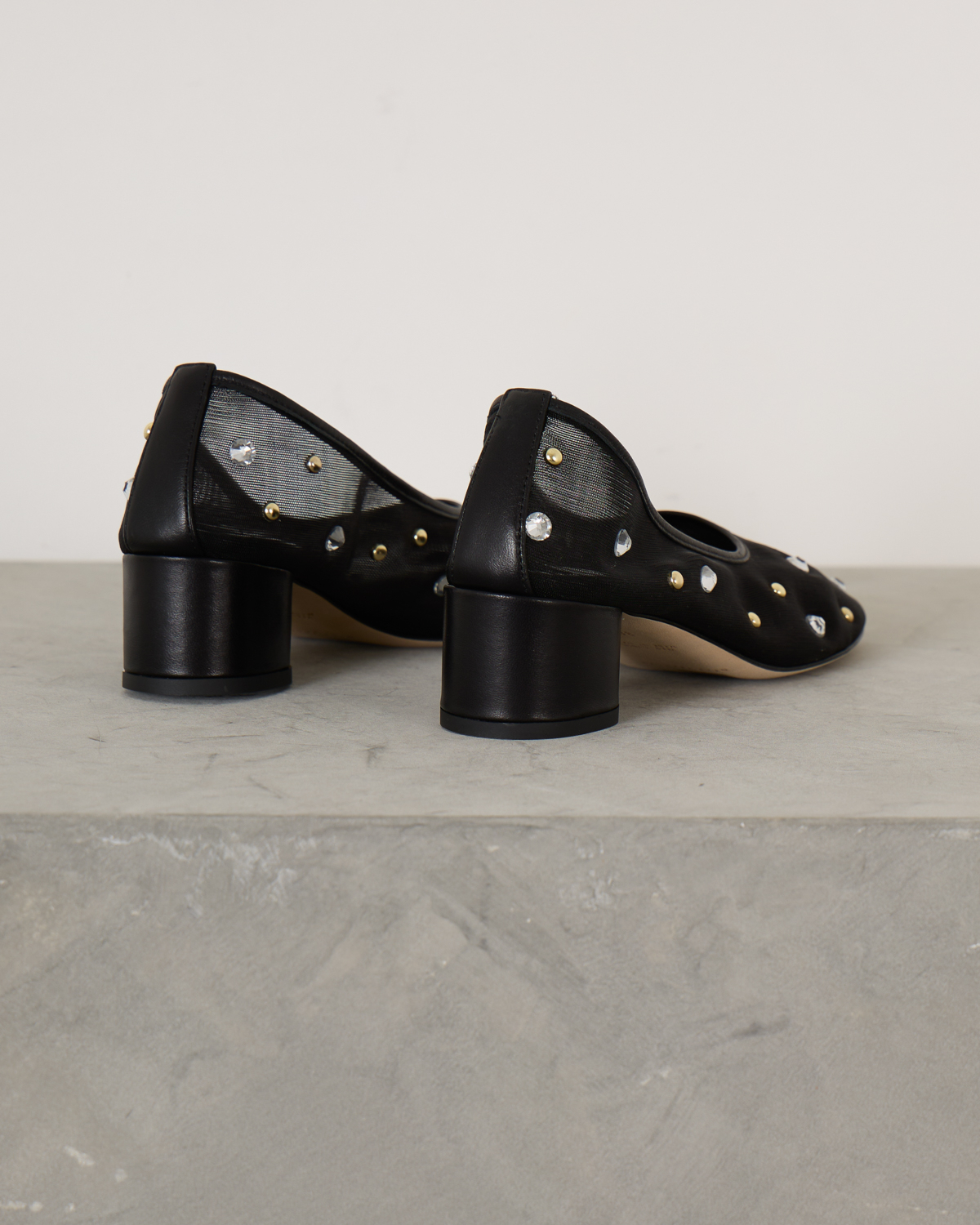 Ontdek de Balla pump in het zwart gemaakt van doorschijnend Italiaans mesh en geplaatst op een cilindrische blokhak. Voorzien van Crystals en studs in goud met een met leer beklede en gewatteerde binnenzool.