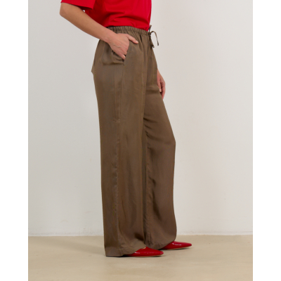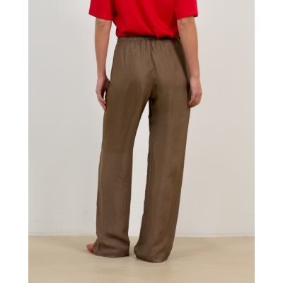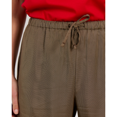 Deze elegante broek in warme bruintinten toont een verfijnd check dessin dat tijdloze sophistication uitstraalt. De losvallende pasvorm en fluïde 100% viscose stof zorgen voor een comfortabele, moderne look. Met elastische taille en subtiele trekkoord combineer je gemak met stijl. De wijde pijpen en steekzakken maken dit design zowel praktisch als verfijnd.