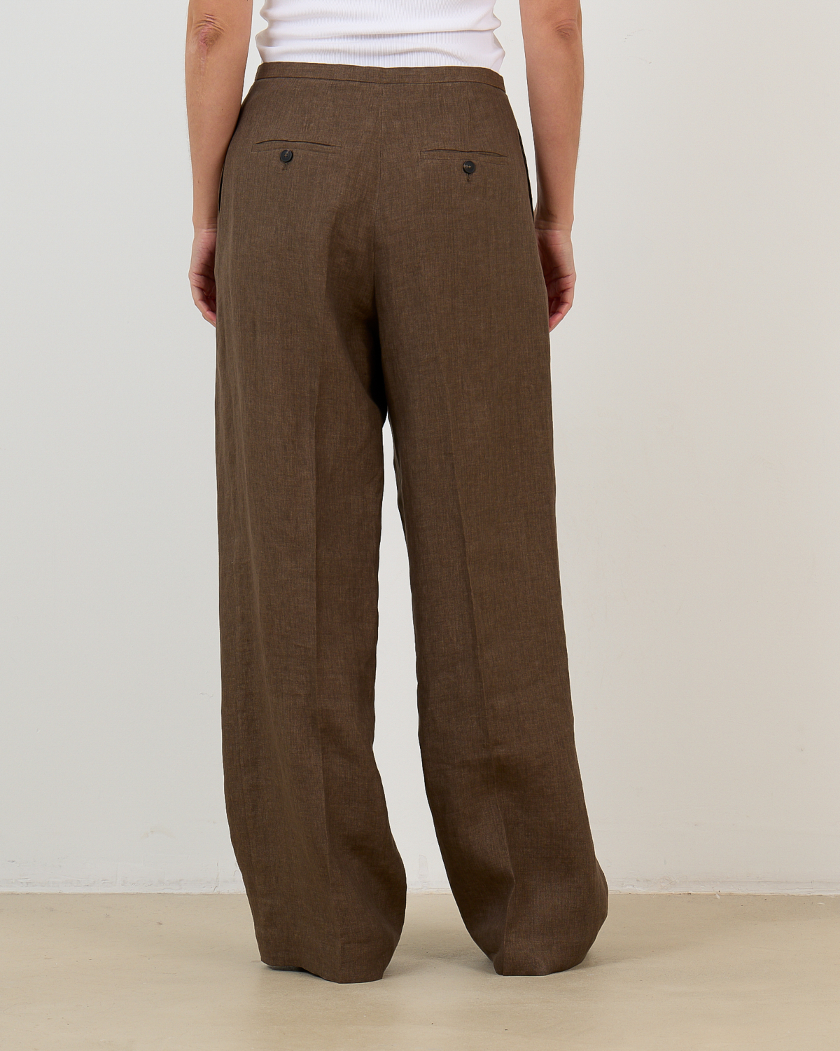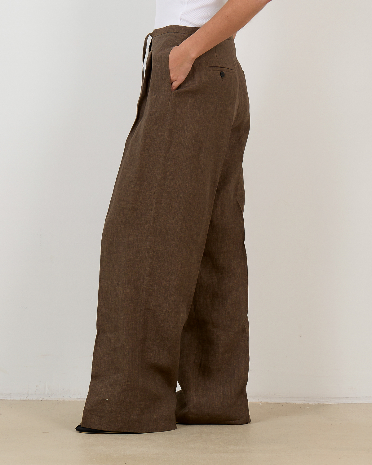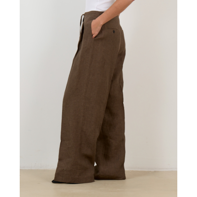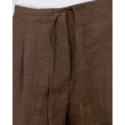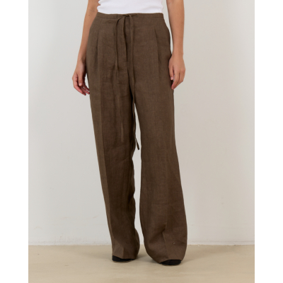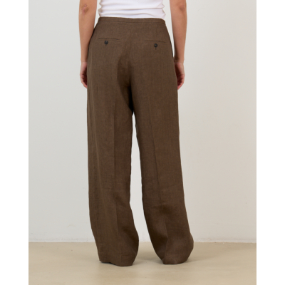 Deze bruine pantalon van 100% linnen biedt je comfort en elegantie in één ontwerp. De regular fit met wijde pijpen creëert een ontspannen silhouet, terwijl de verstelbare trekkoord in de taille voor een perfecte pasvorm zorgt. Steekzakken aan de voorkant en knoopzakjes achteraan voegen functionaliteit toe aan het design. Het natuurlijke linnen ademt heerlijk en valt mooi.