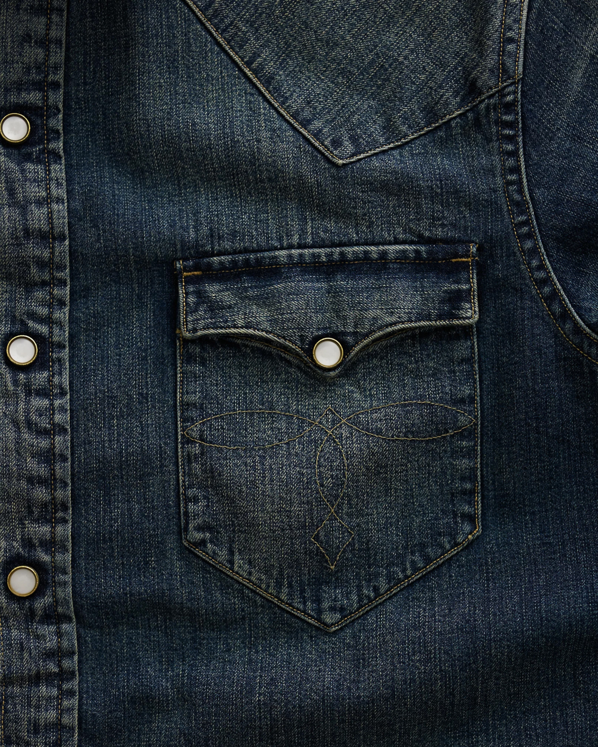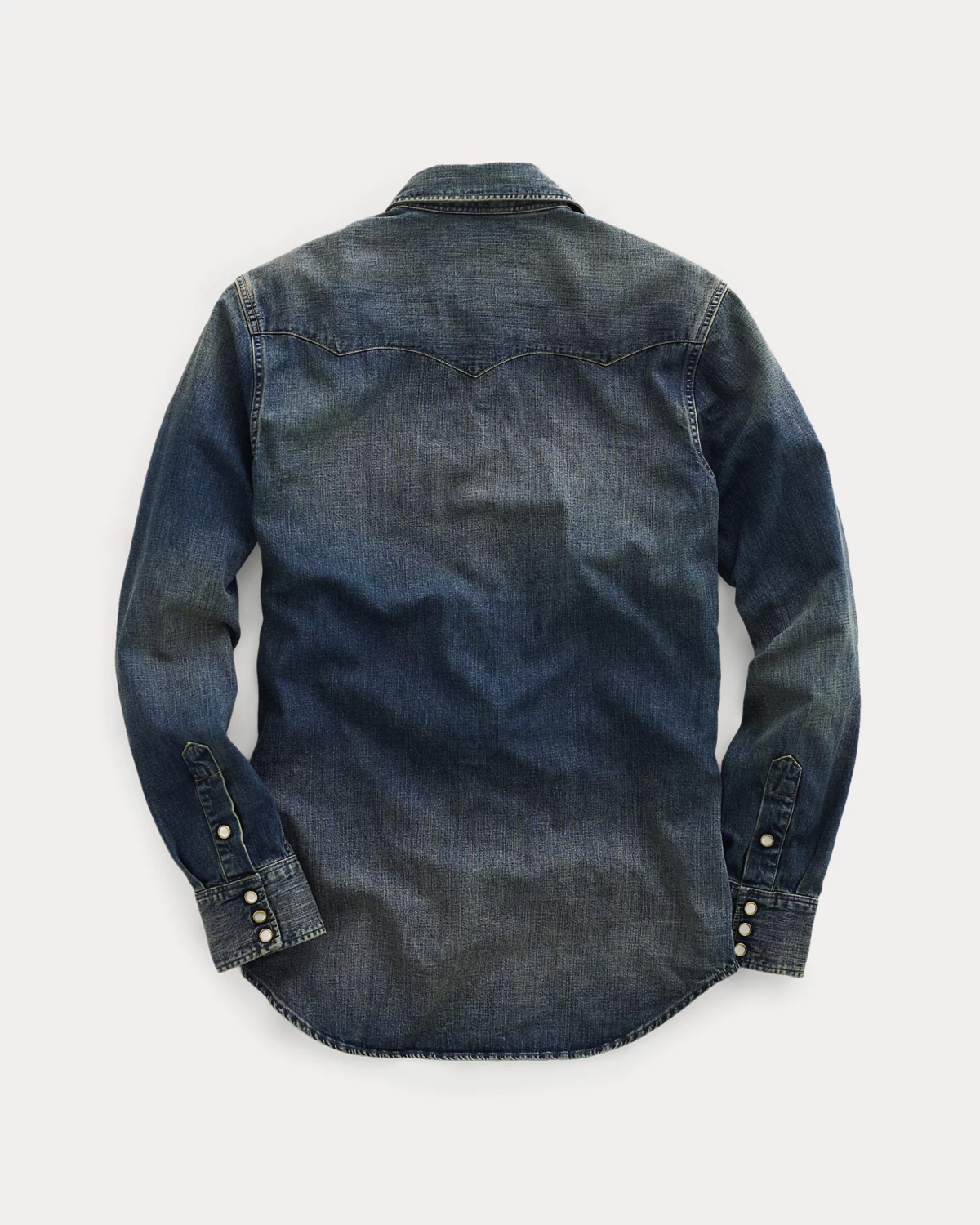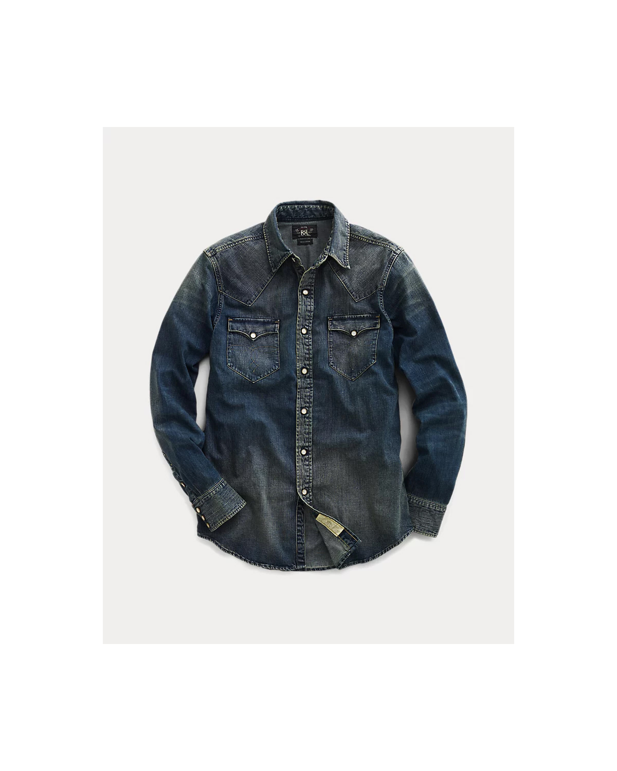 Nauwsluitend western overhemd van het merk RRL, gemaakt van Japans indigo denim. Voorzien van triple-needle kettingsteek voor extra duurzaamheid. Afgewerkt met speciaal vervaardigde Japanse drukknopen met hoge rand.