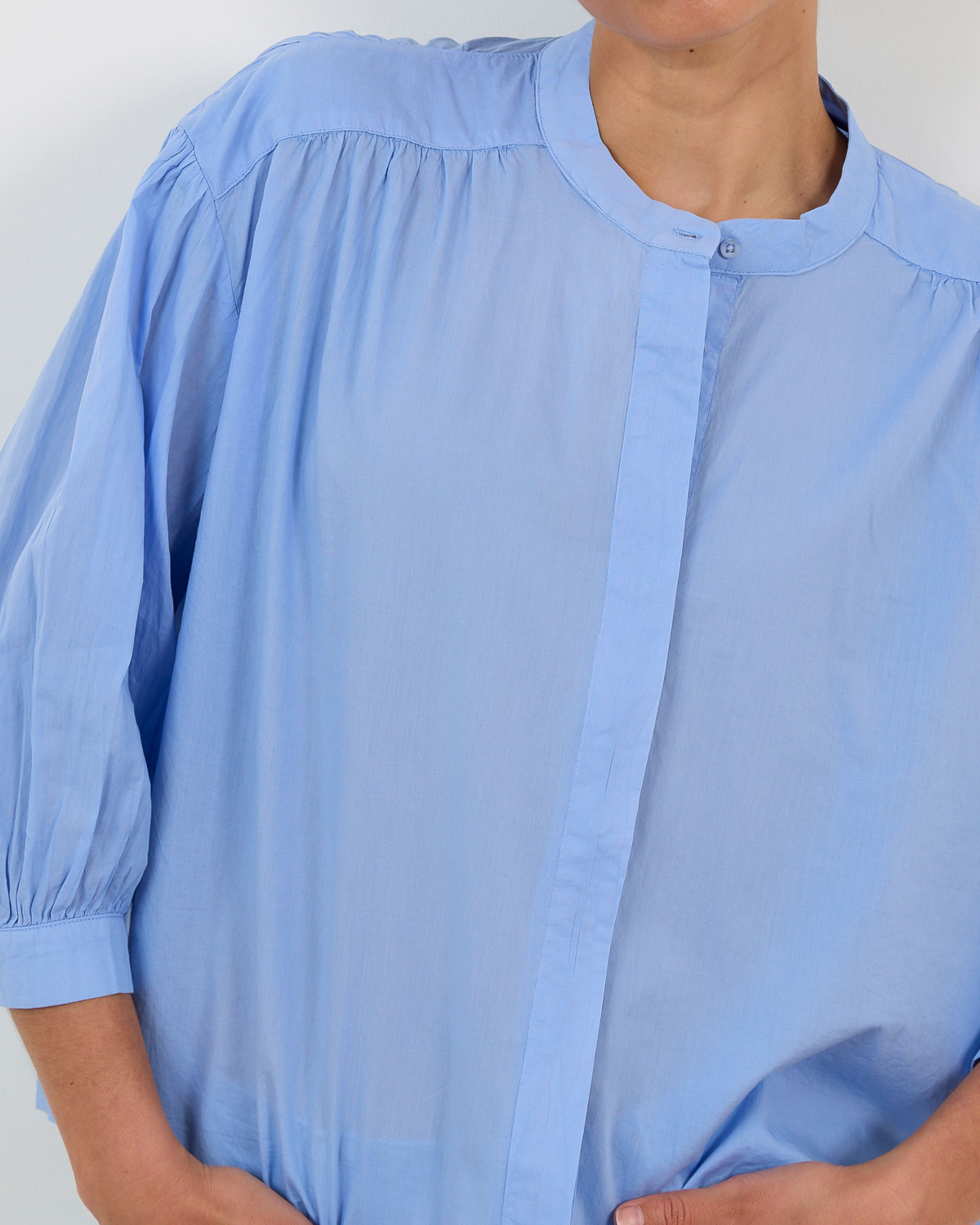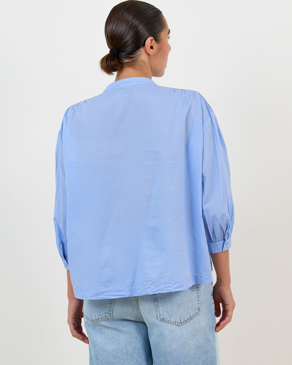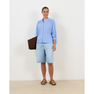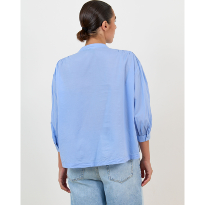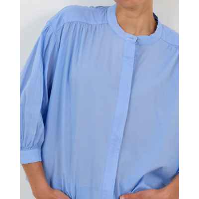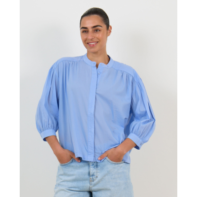 Deze stijlvolle blouse in hemelsblauw combineert moderne elegantie met comfort. De zachte katoenen stof zorgt voor een aangenaam draaggevoel, terwijl de relaxed fit een nonchalante uitstraling creëert. De mandarin kraag geeft een eigentijdse twist aan dit klassieke ontwerp. Opvallende ballonmouwen met elastische boorden voegen speelsheid toe, terwijl de subtiele knoopsluiting verfijning brengt.