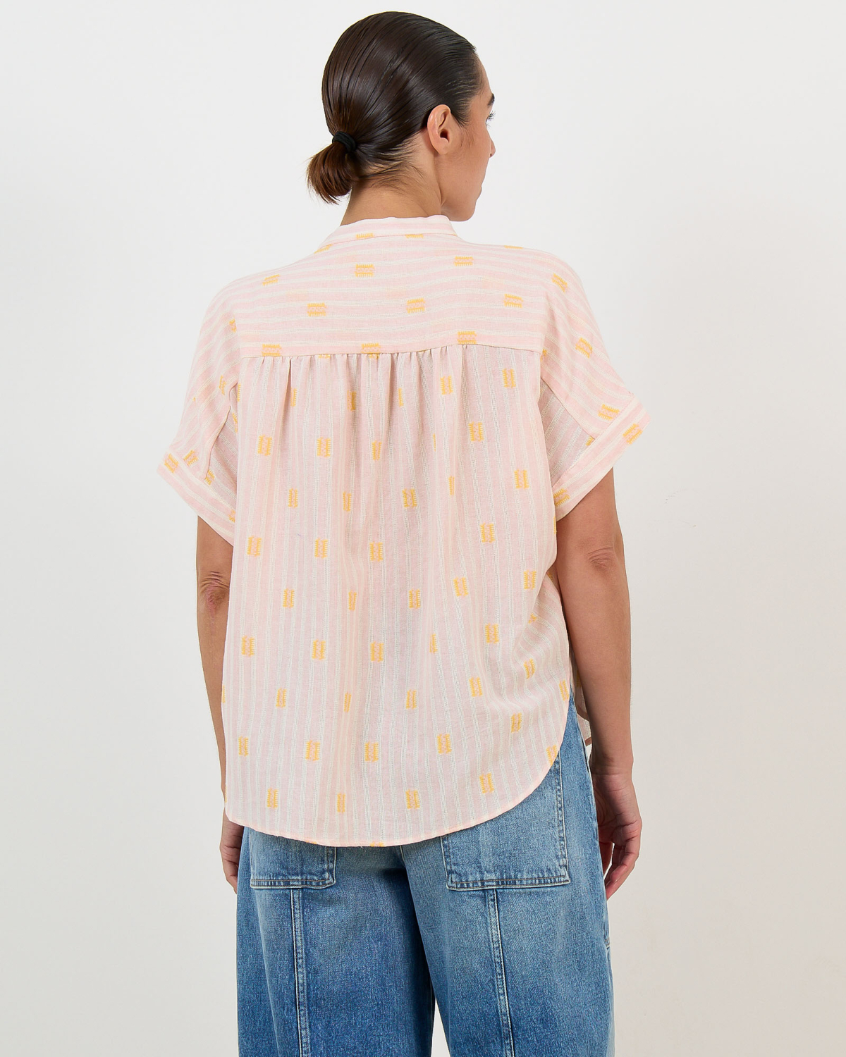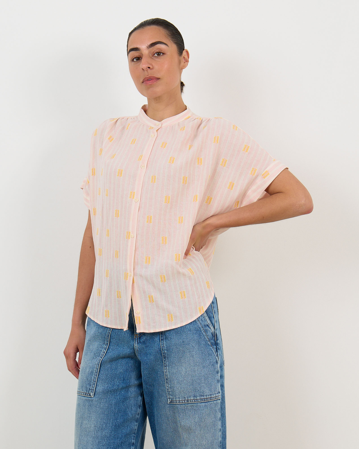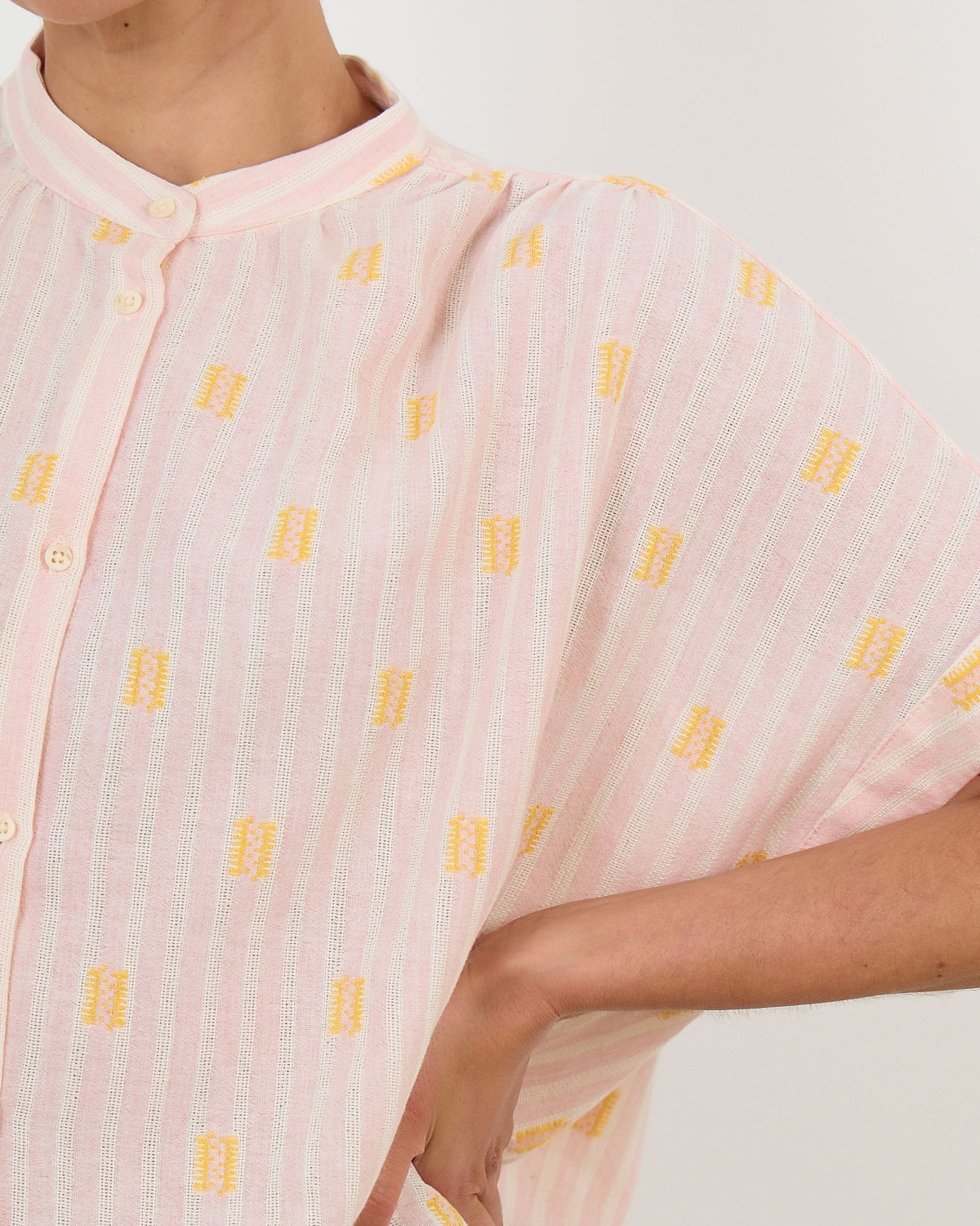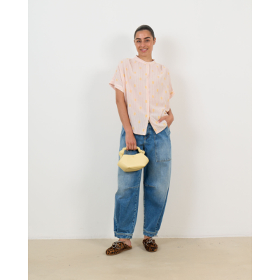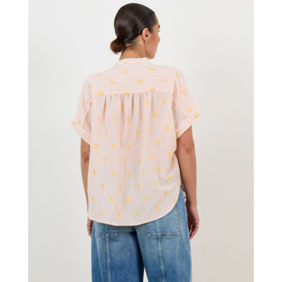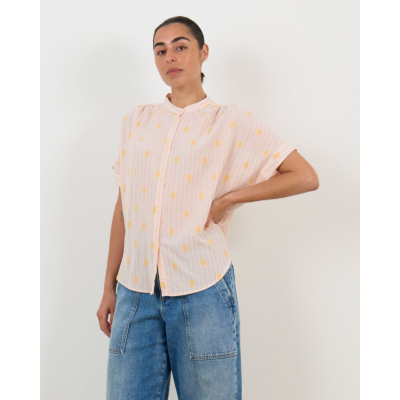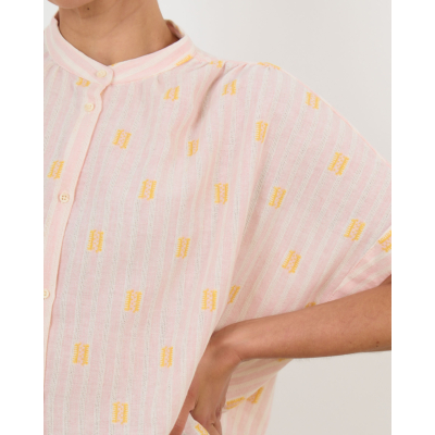 Deze roze blouse in de Jerico print combineert elegantie met speelse details. De relaxed fit en korte mouwen zorgen voor een comfortabele draagervaring, terwijl de zachte mix van 60% katoen, 38% viscose en kleine accenten van polyester en andere vezels een luxueuze uitstraling geeft. Het gele motief over de gehele stof en de knoopsluiting maken dit een opvallend item dat perfect past bij de moderne vrouw.