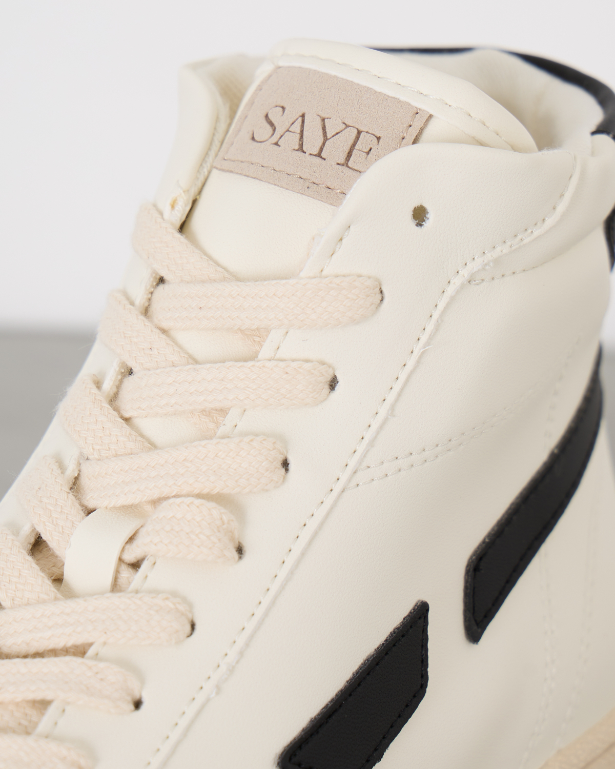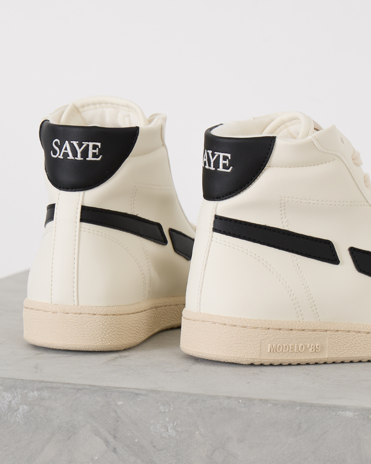 De Modelo '89 sneakers van Saye is gemaakt van vegan maïsleer op biologische basis en is voorzien van een bamboe voering en vleugje vegan suède op de punt. Het high-top model komt in het wit en heeft aan de zijkant en hiel zwarte panelen. Op de tong is er een suède-logo geplaatst.