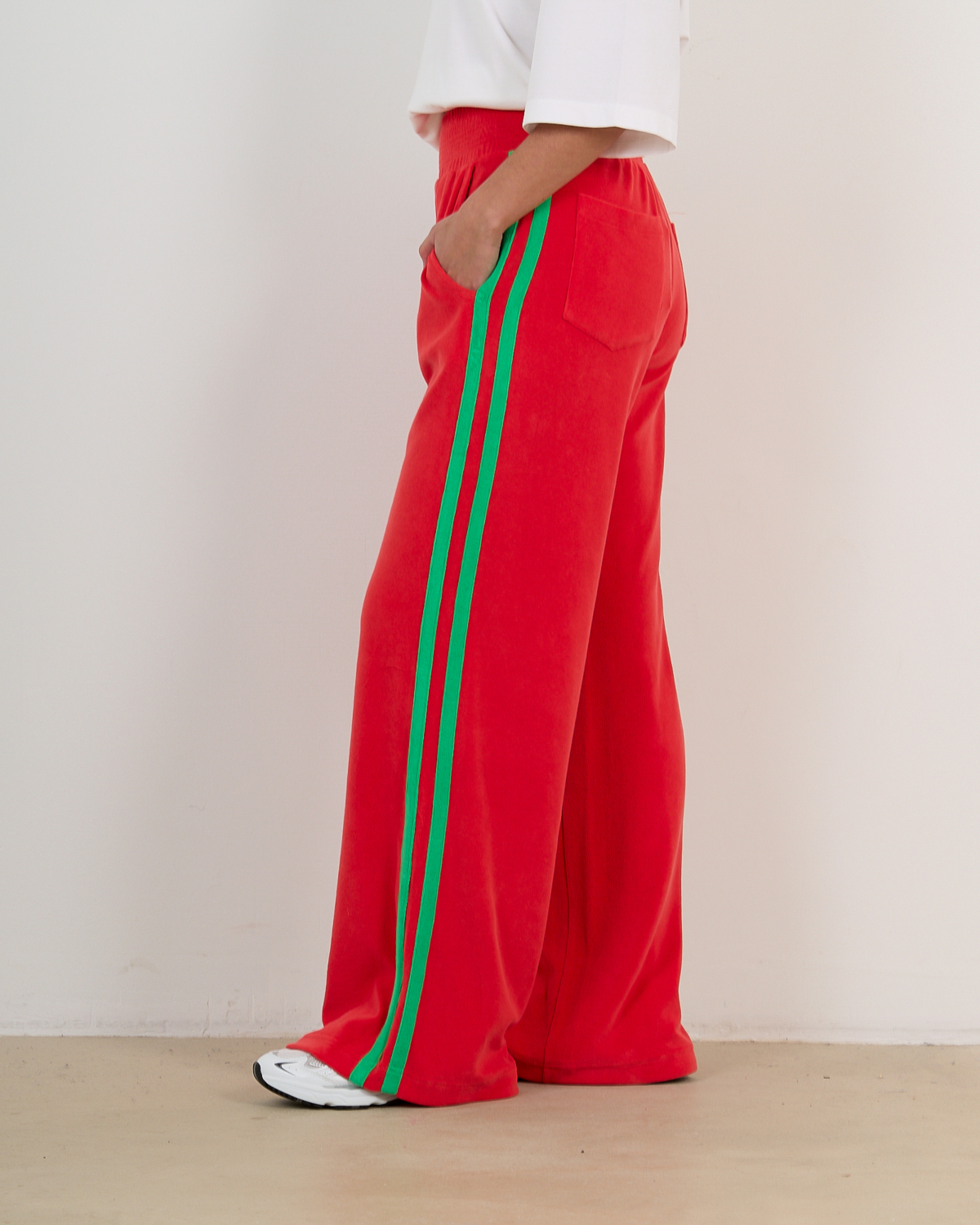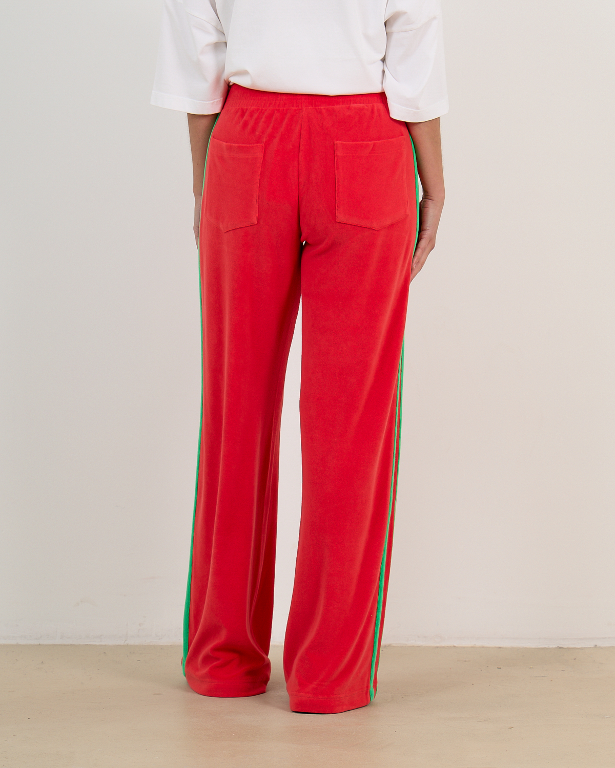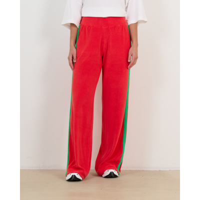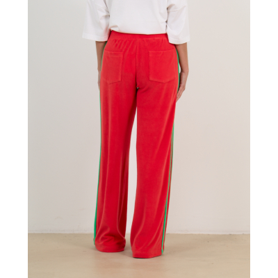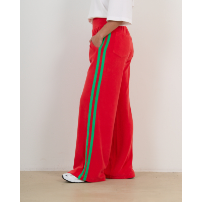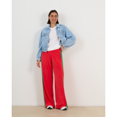 Deze opvallende rode sweatpants van badstof combineert comfort met een trendy sportieve uitstraling. De zachte badstofstof (83% katoen, 17% polyamide) zorgt voor optimaal draagcomfort, terwijl de relaxed fit een moderne, ruime pasvorm biedt. De groene contrastbies langs de zijkanten geeft dit item een speelse twist. Praktische steekzakken aan voor- en achterzijde maken deze broek functioneel voor elke dag. De elastische tailleband biedt extra comfort.