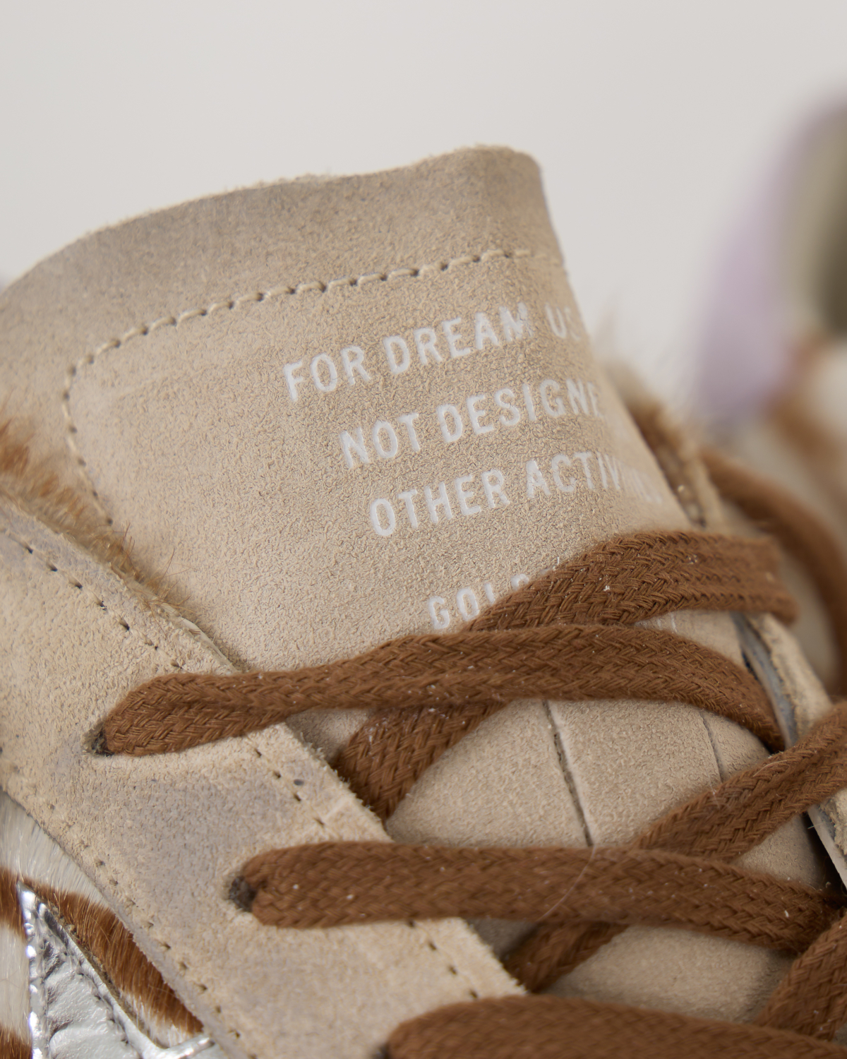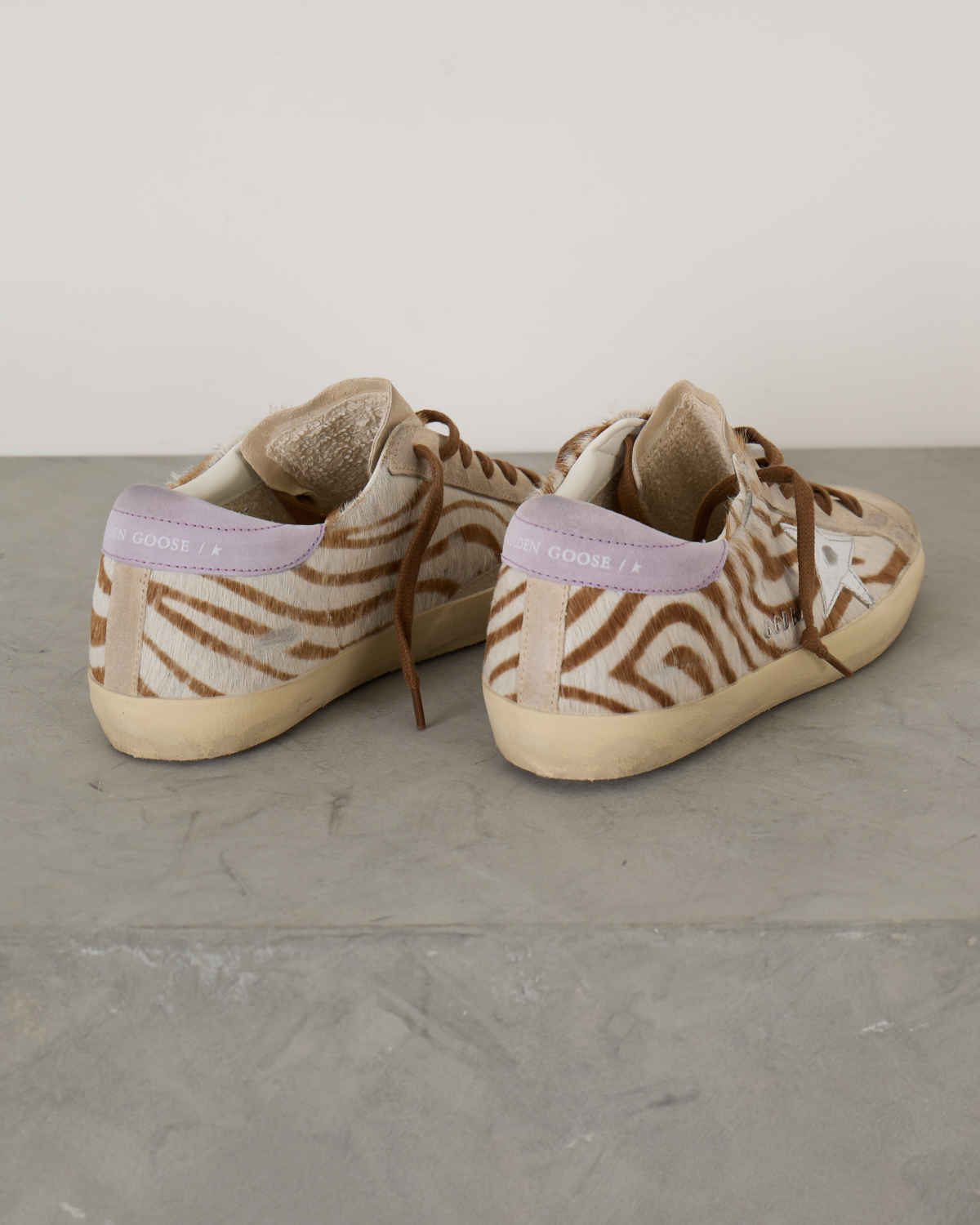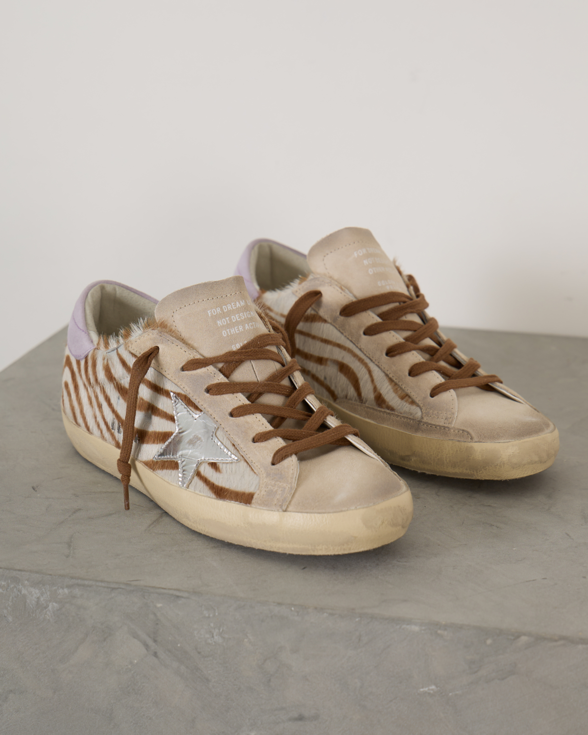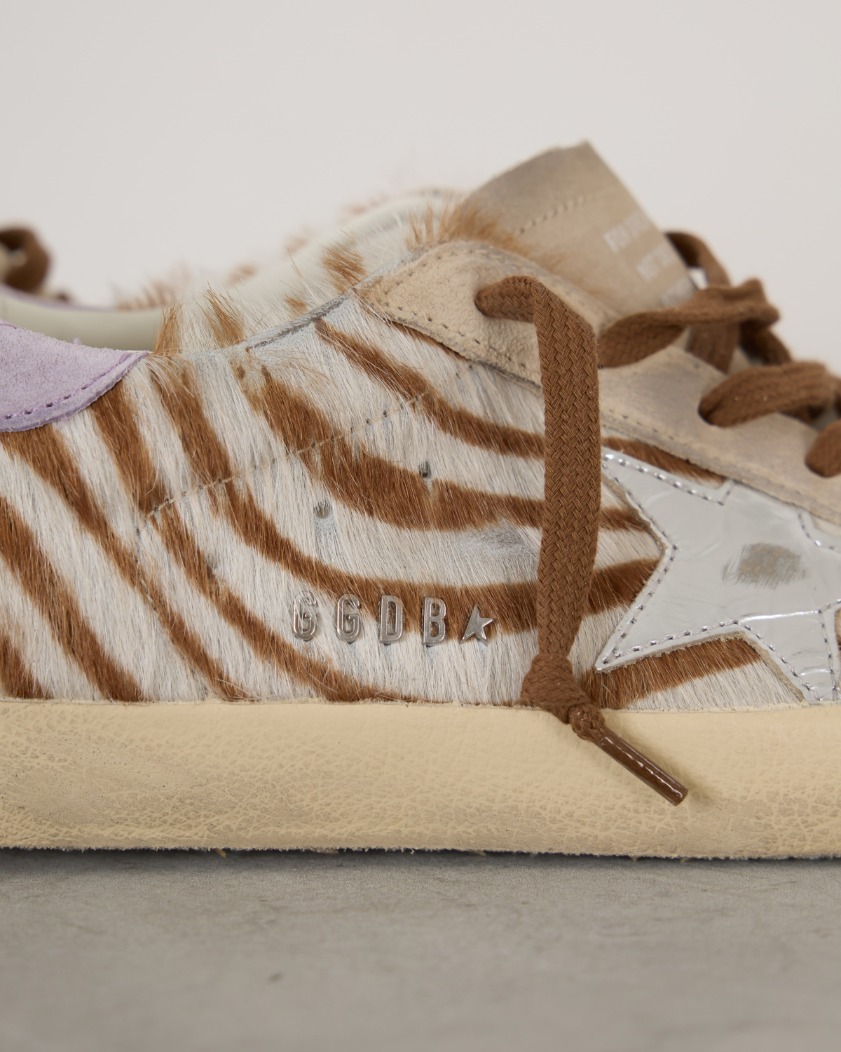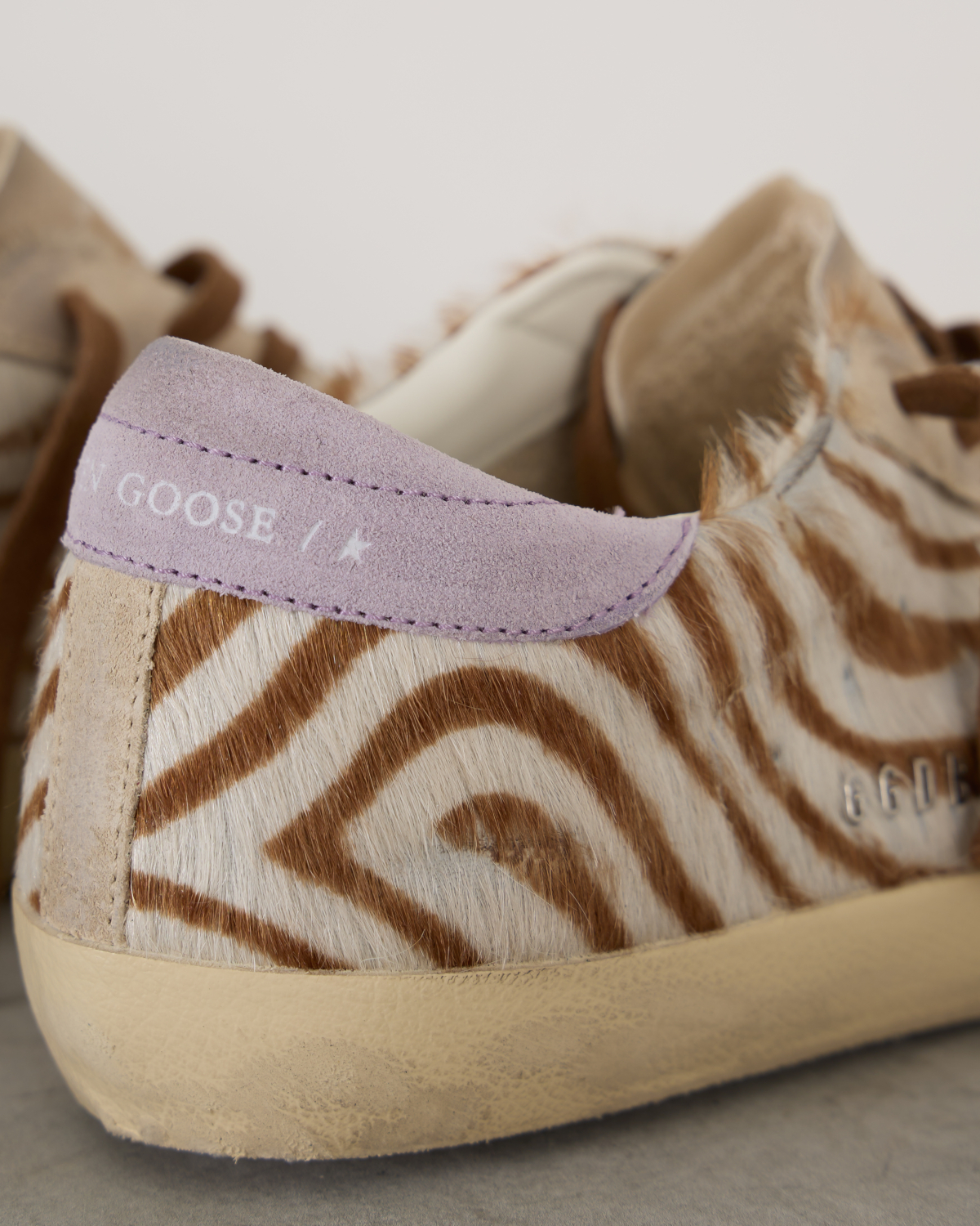 Deze Golden Goose Super-Star sneakers onderscheiden zich door hun authentieke vintage uitstraling. De opvallende zebra-textuur in bruintinten geeft de buitenzijde een unieke look, terwijl de contrasterende lila hiel voor een speels accent zorgt. De zilverkleurige ster op de zijkant vormt de finishing touch.