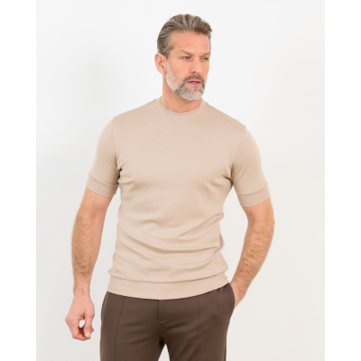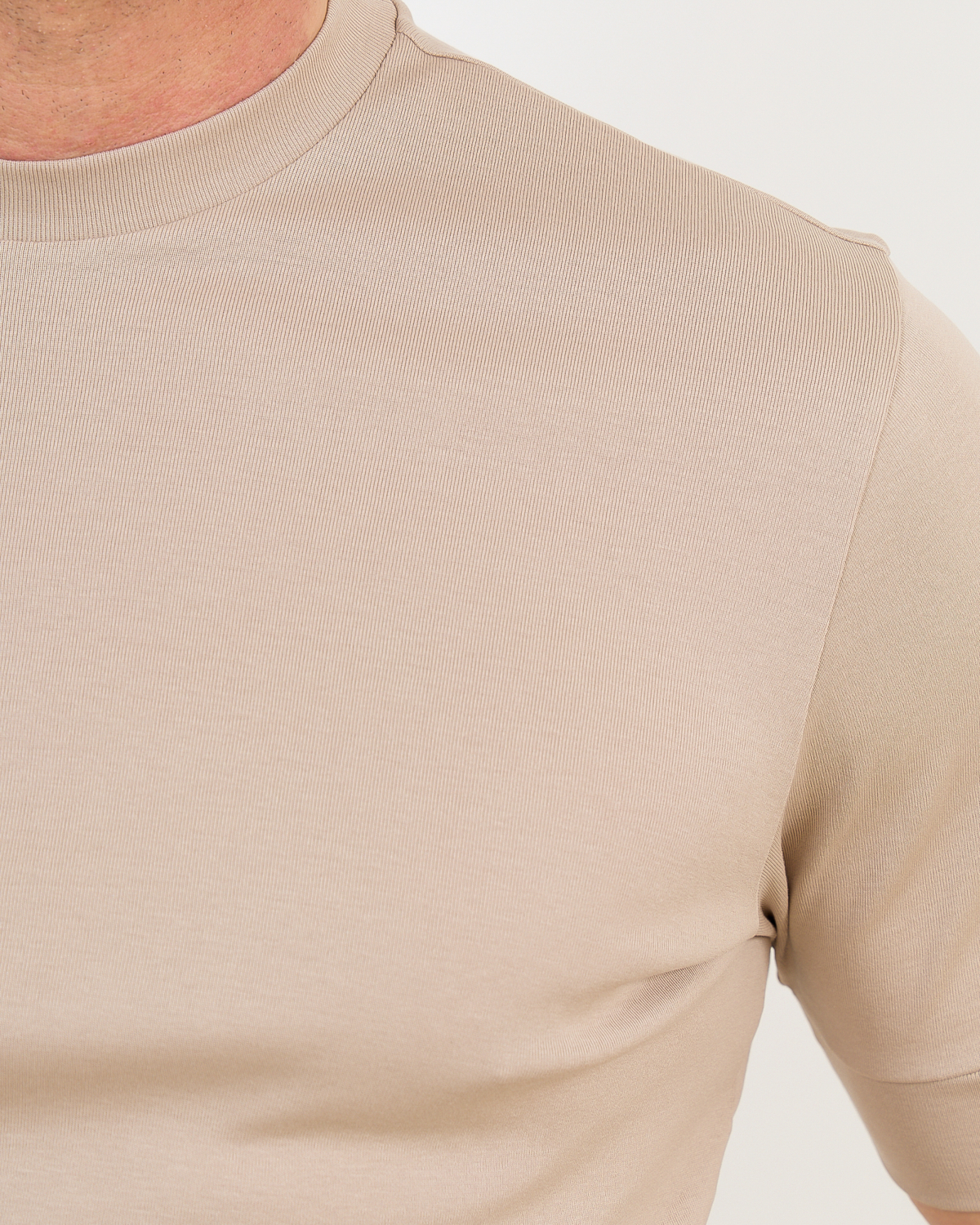 Combineer dit beige t-shirt met donkere jeans en witte sneakers voor een casual look, of draag het onder een blazer met chino's voor een verzorgde stijl. De neutrale kleur maakt het shirt veelzijdig te matchen met navy, grijs of bruintinten.