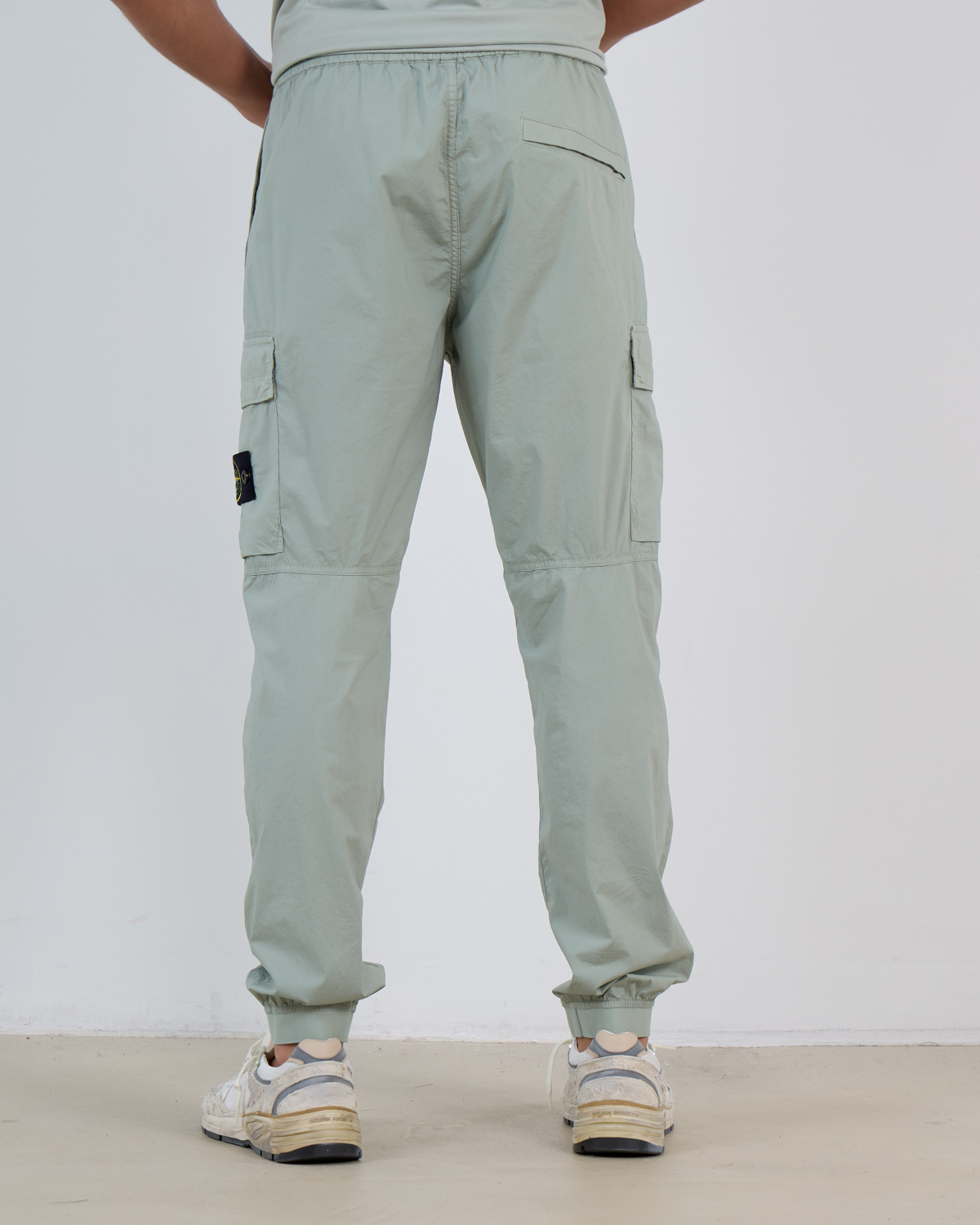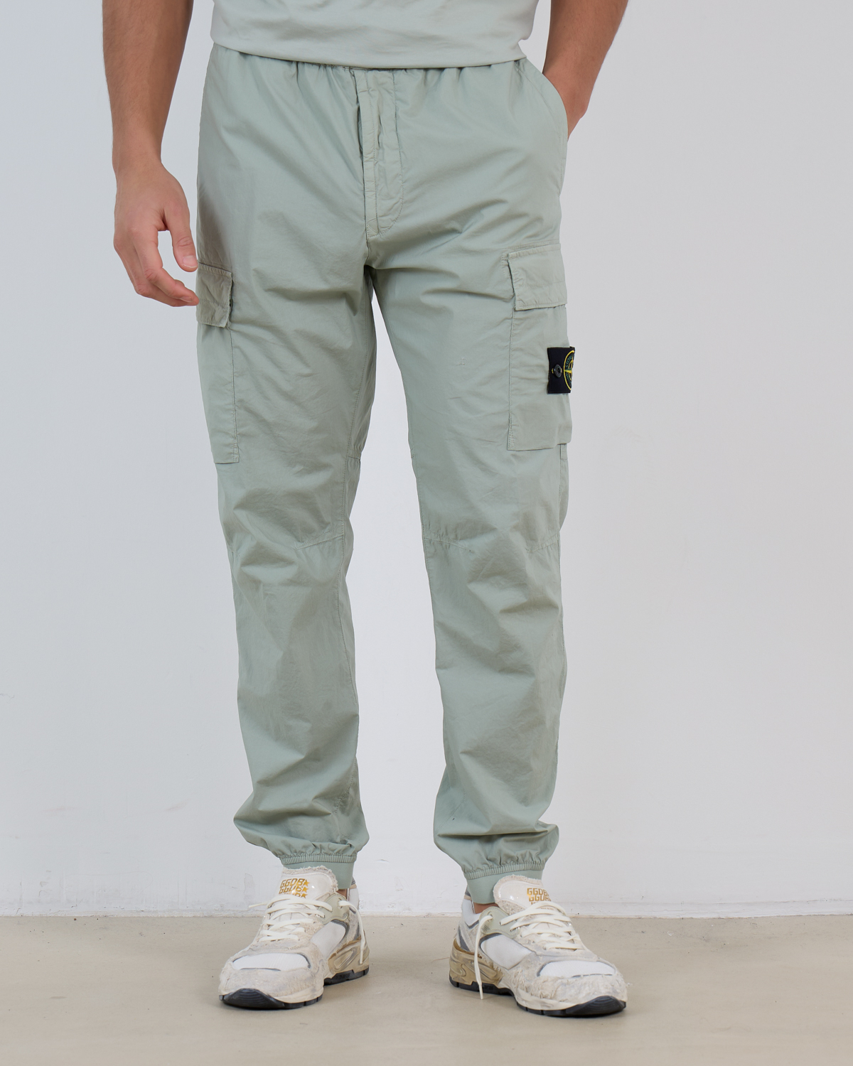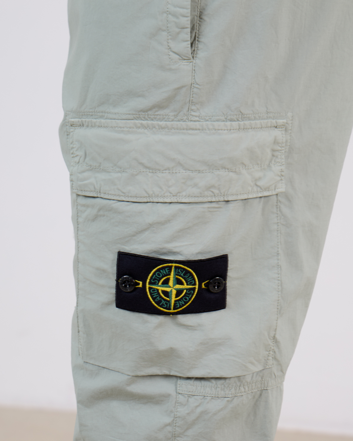 Deze lichtgroene cargo broek van Stone Island combineert militaire stijl met modern comfort. De regular fit biedt een ontspannen pasvorm, terwijl de katoen-elastaan samenstelling (97% katoen, 3% elastaan) zorgt voor bewegingsvrijheid en duurzaamheid. Kenmerkend zijn de meerdere cargo zakken aan de zijkanten en het iconische Stone Island kompas logo op de dijzak. De elastische tailleband en enkelmanchetten geven de broek een eigentijdse streetwear uitstraling.
