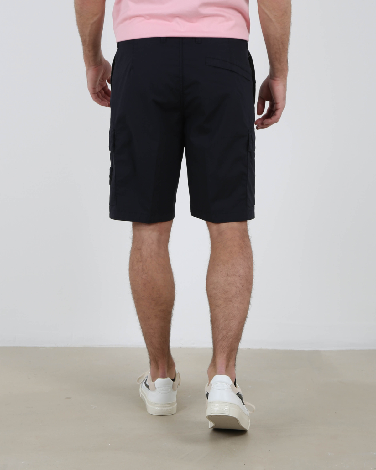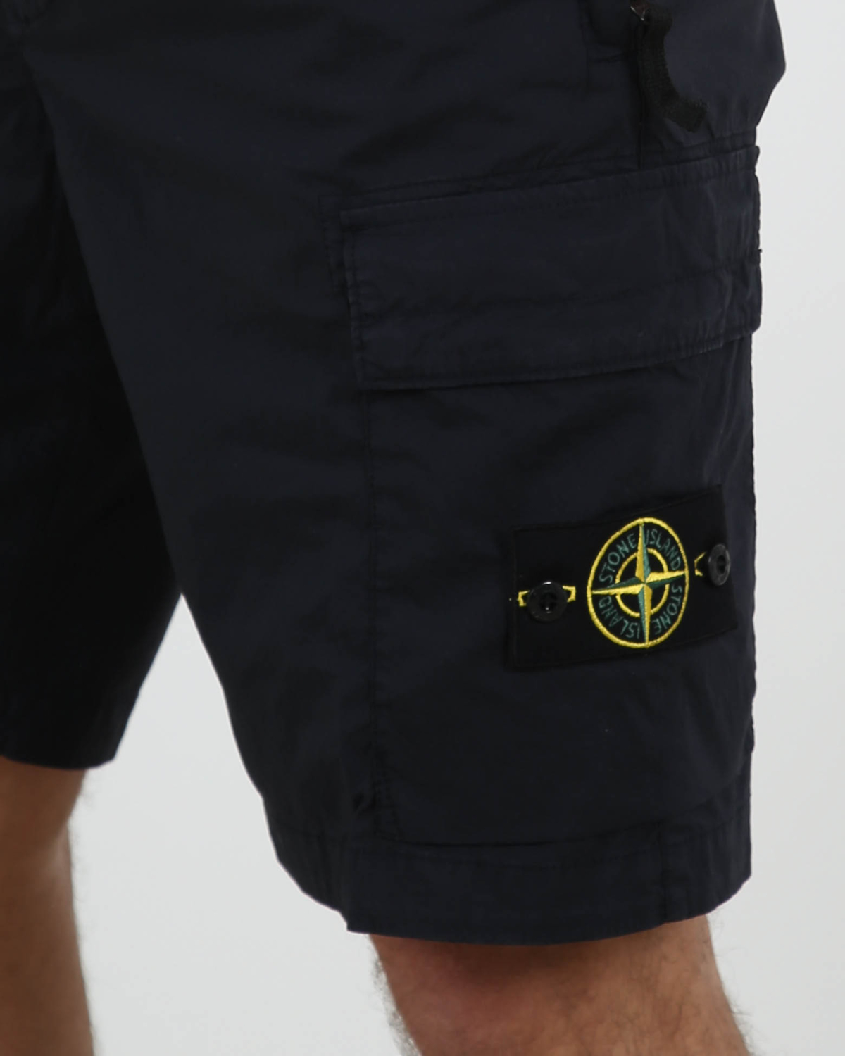 Bermuda Short van Stone Island is gemaakt van licht stretchkatoencanvas en komt in de kleur A0020 Navy. De short heeft een normale pasvorm en is voorzien van steekzakken in de naad met verborgen ritssluiting, een enkele achterzak en een knoop- en ritssluiting. Op de pijpen zijn er cargo klepzakken geplaatst, waarvan de linkerzak is voorzien van een Stond Island-bagde.