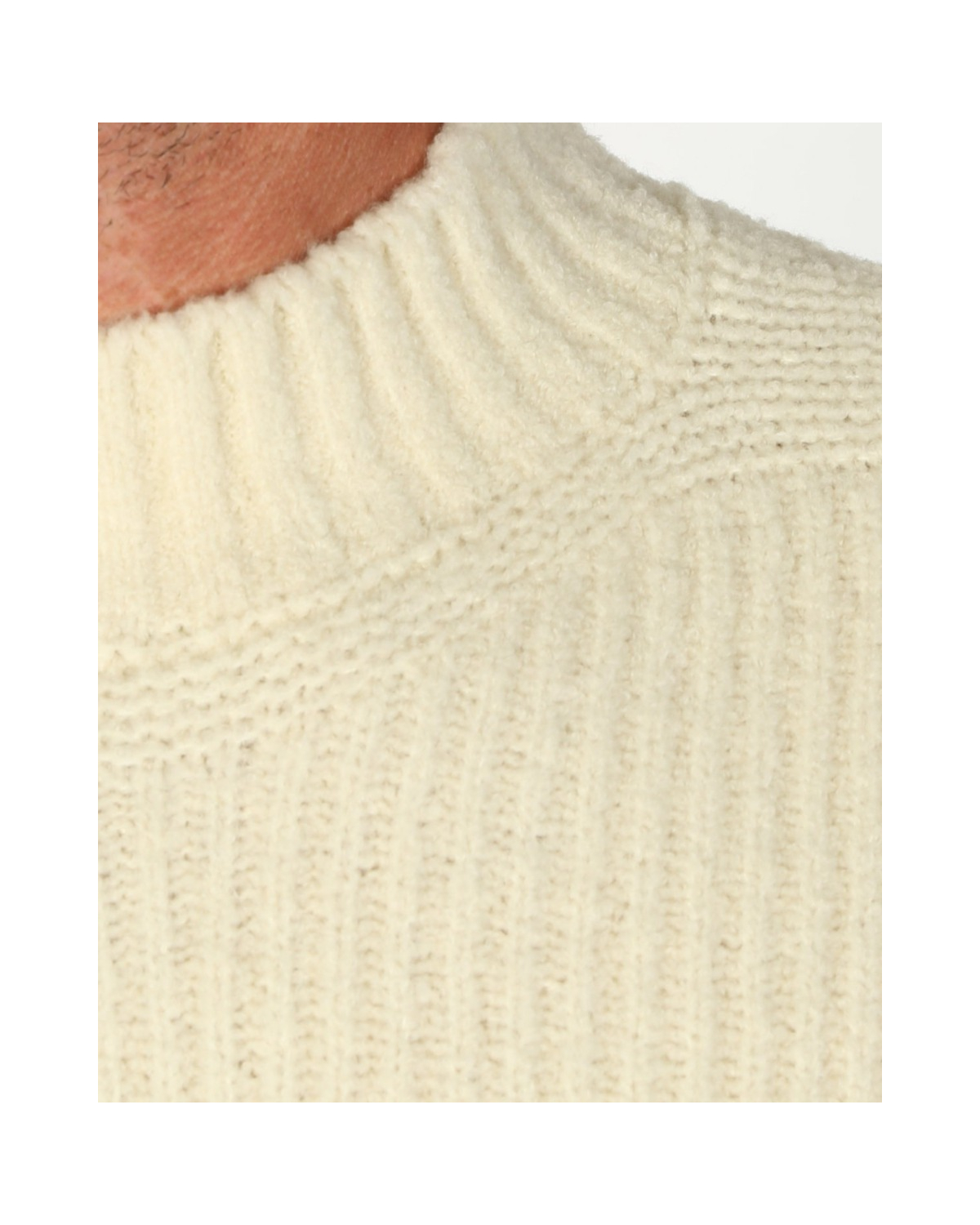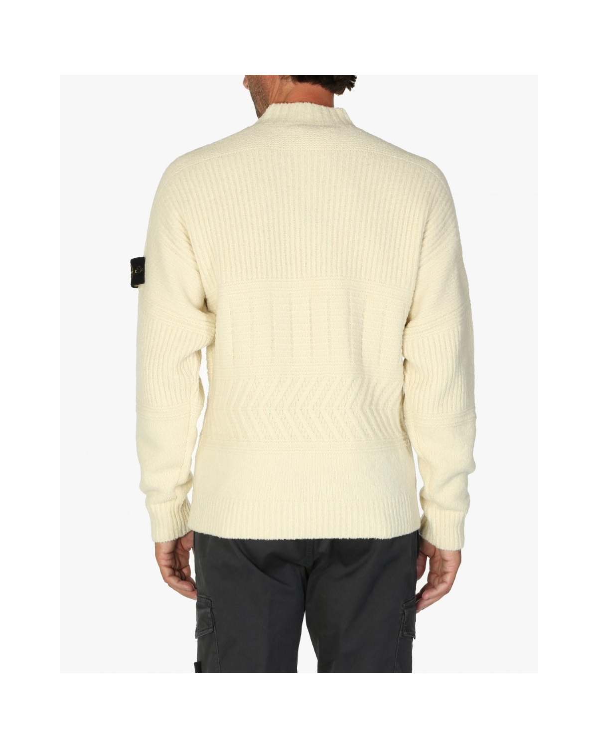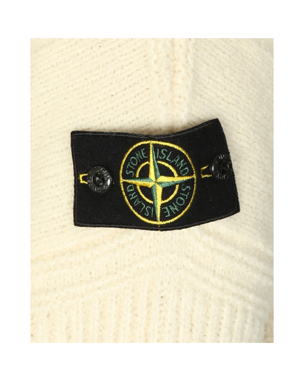 Witte wollen trui van het merk Stone Island. De trui heeft verschillende patroontjes erin gebreid en heeft een oversized pasvorm. Op de linkermouw heeft de trui een Stone Island logo.