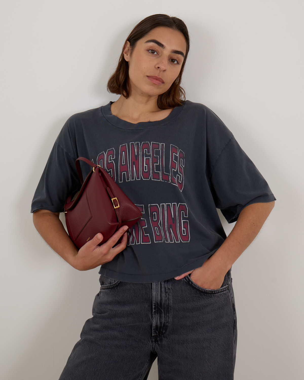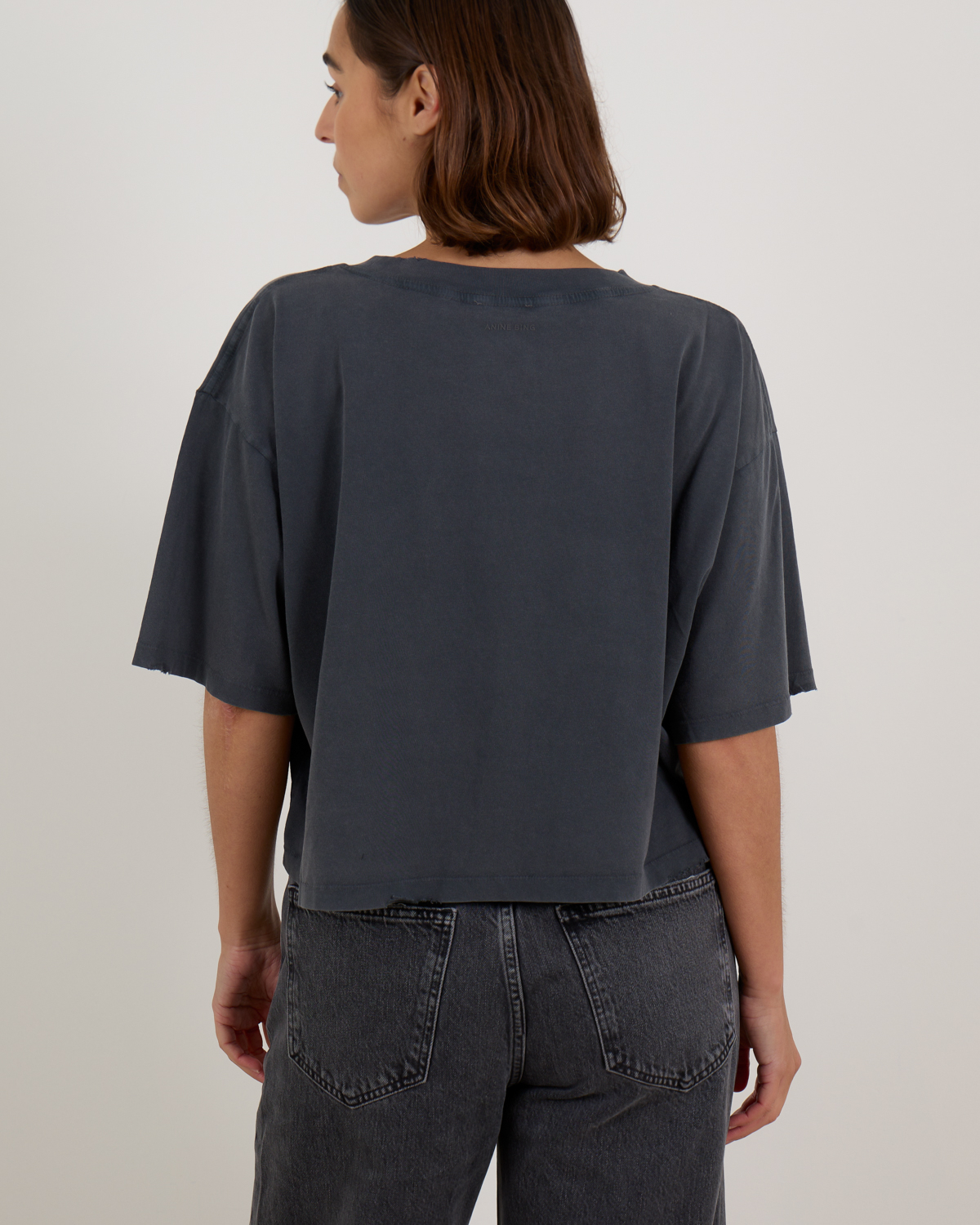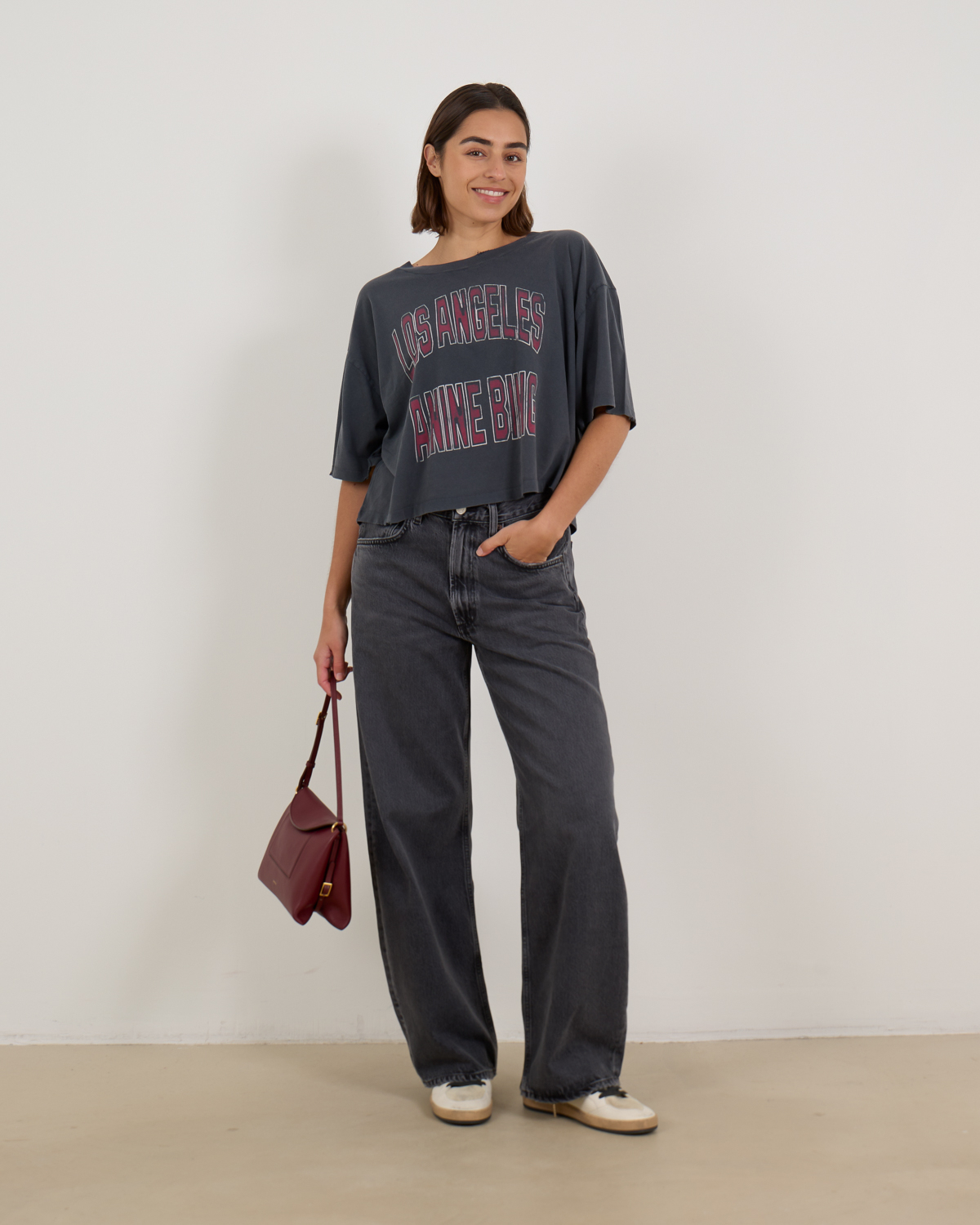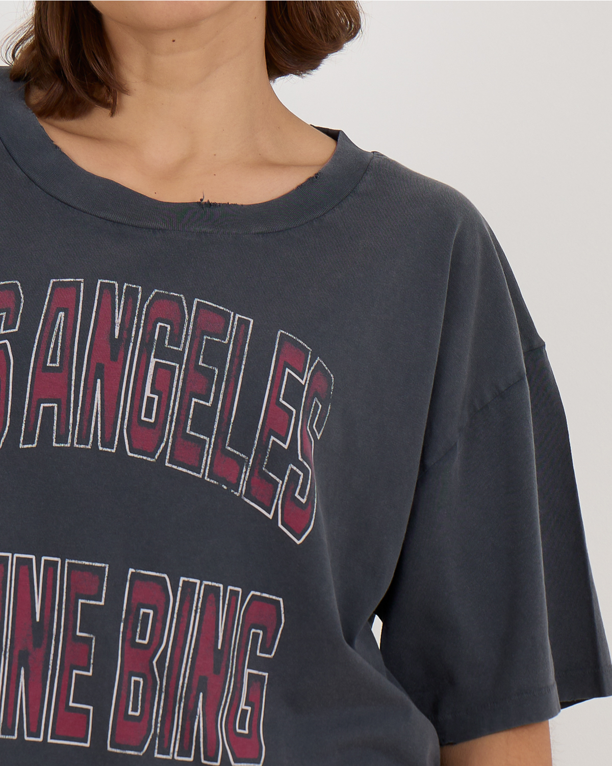 Dit stijlvolle cropped shirt straalt moderne rock-chic uit met zijn opvallende 'Los Angeles' en 'Anine Bing' print op de voorzijde. De verwassen zwarte kleur geeft het shirt een authentiek vintage karakter. De boxy pasvorm zorgt voor een trendy, relaxte uitstraling, terwijl de korte mouwen en ronde hals comfort bieden. Vervaardigd uit 100% katoen voor optimaal draagcomfort en duurzaamheid.