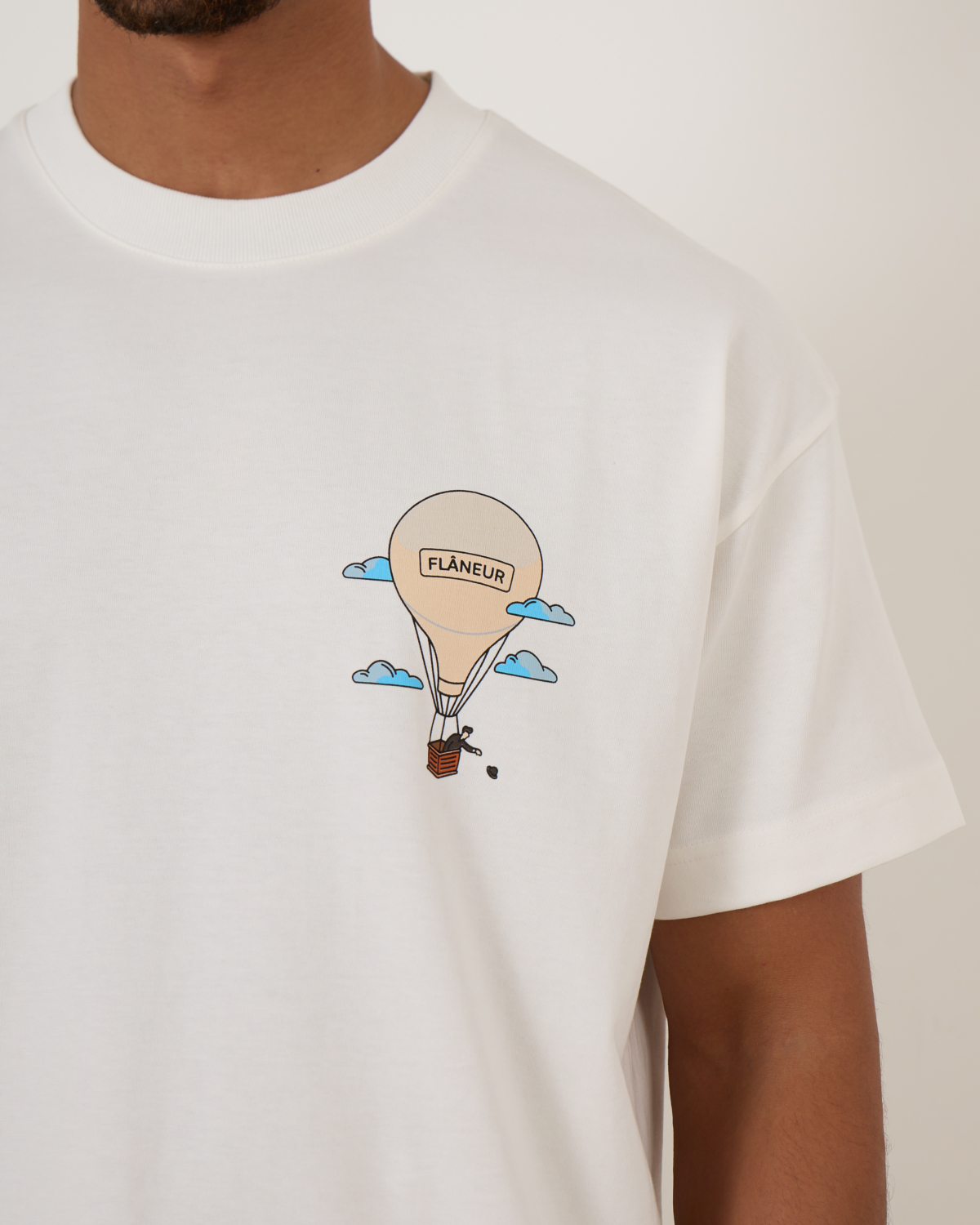Het Aéronautique T-shirt van Flâneur in wit is uitgevoerd in een relaxed fit en voorzien van een subtiele print op de borst en een illustratieve luchtballonprint op de achterkant. Een modern ontwerp met een speelse, grafische twist.
