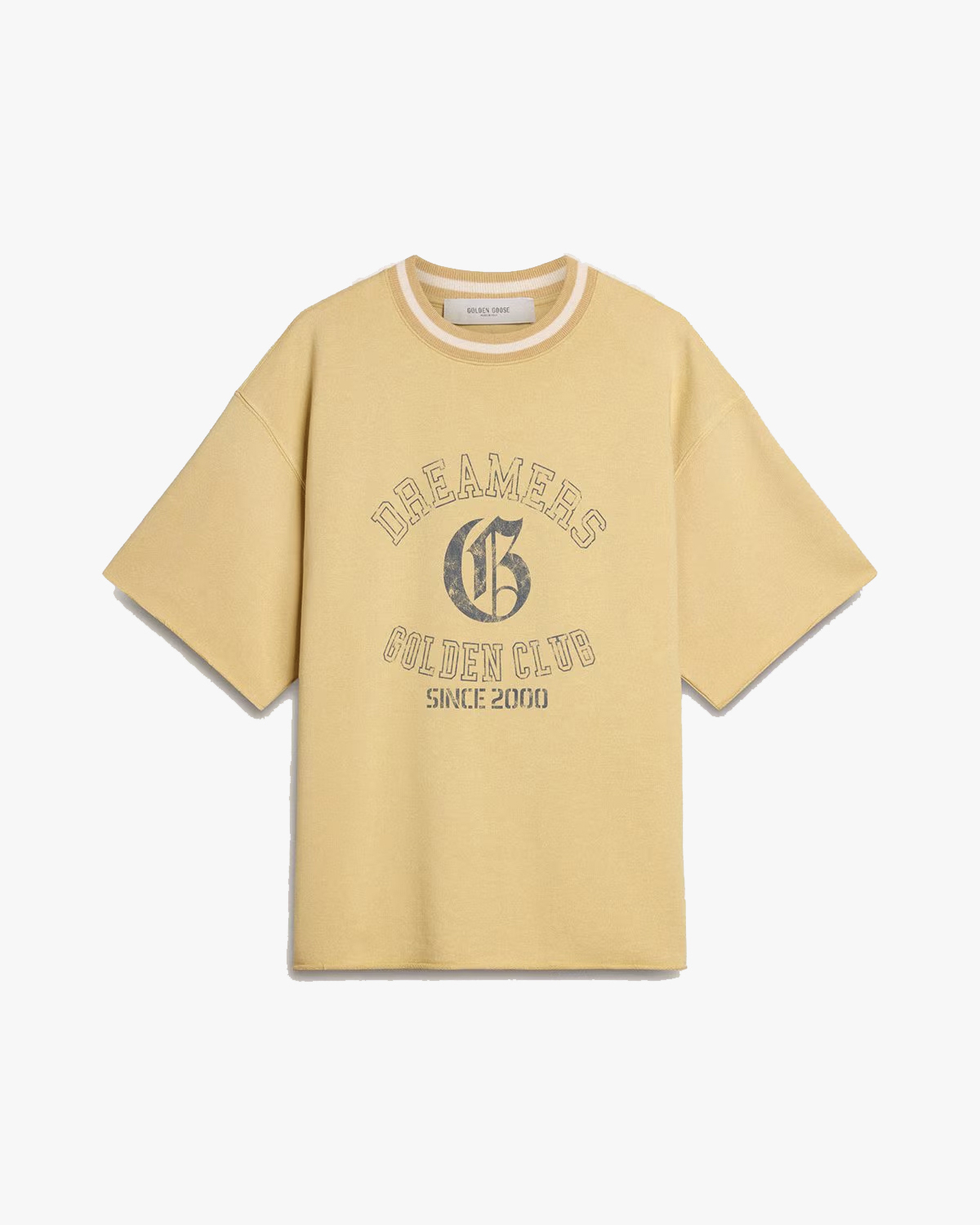 Dit Italiaanse T‑shirt van Golden Goose belichaamt de zorgeloze seventies vibe. Gemaakt van 100 % katoen met een comfortabele oversized fit, is hij voorzien van een opvallende blauwe print op de voorkant en ruwe, onafgewerkte zomen voor een nonchalant effect. De ronde, geribde hals in geel-wit contrasteert subtiel, terwijl twee kleine sterren op de achterkant het typische Golden Goose‑DNA benadrukken