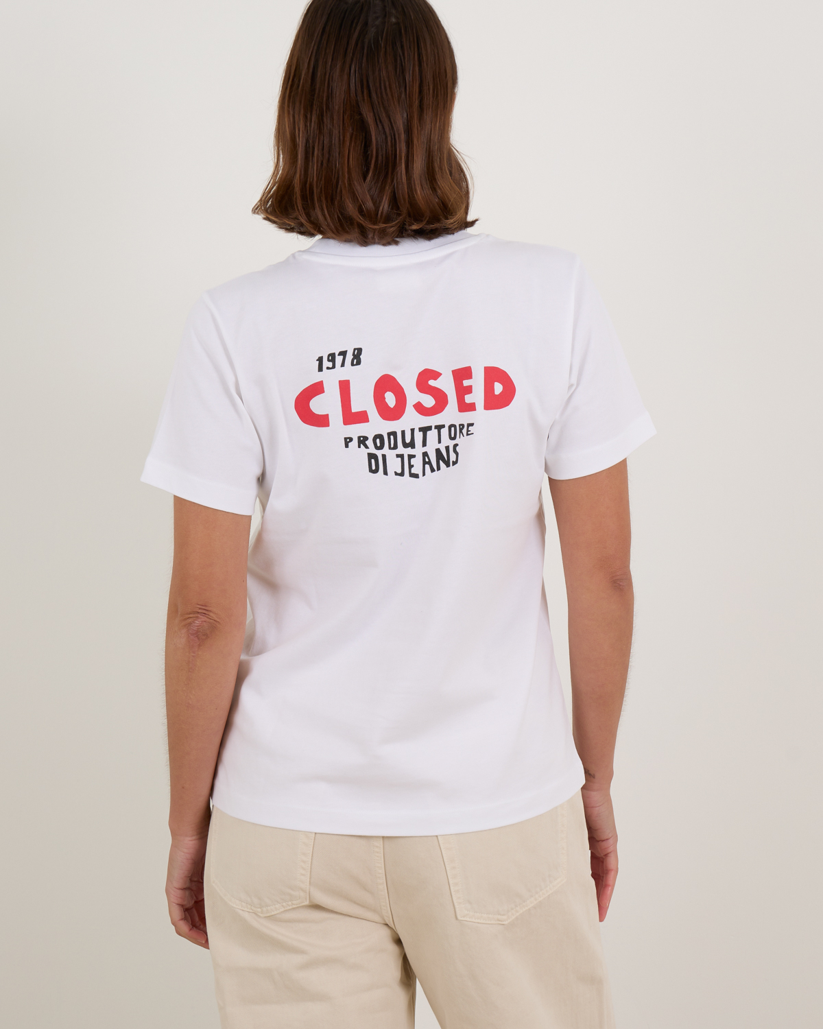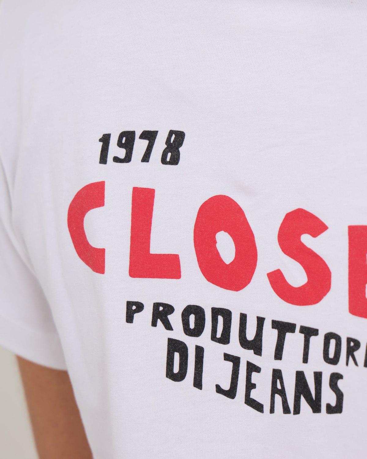 Dit witte t-shirt van 100% katoen heeft een elegante regular fit die comfortabel draagt. De korte mouwen en ronde hals zorgen voor een tijdloze uitstraling, terwijl de opvallende print op de achterkant met "1978 CLOSED PRODUTTORE DI JEANS" tekst een karakteristieke touch toevoegt. Het zachte katoenen materiaal biedt optimaal draagcomfort tijdens de hele dag.