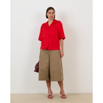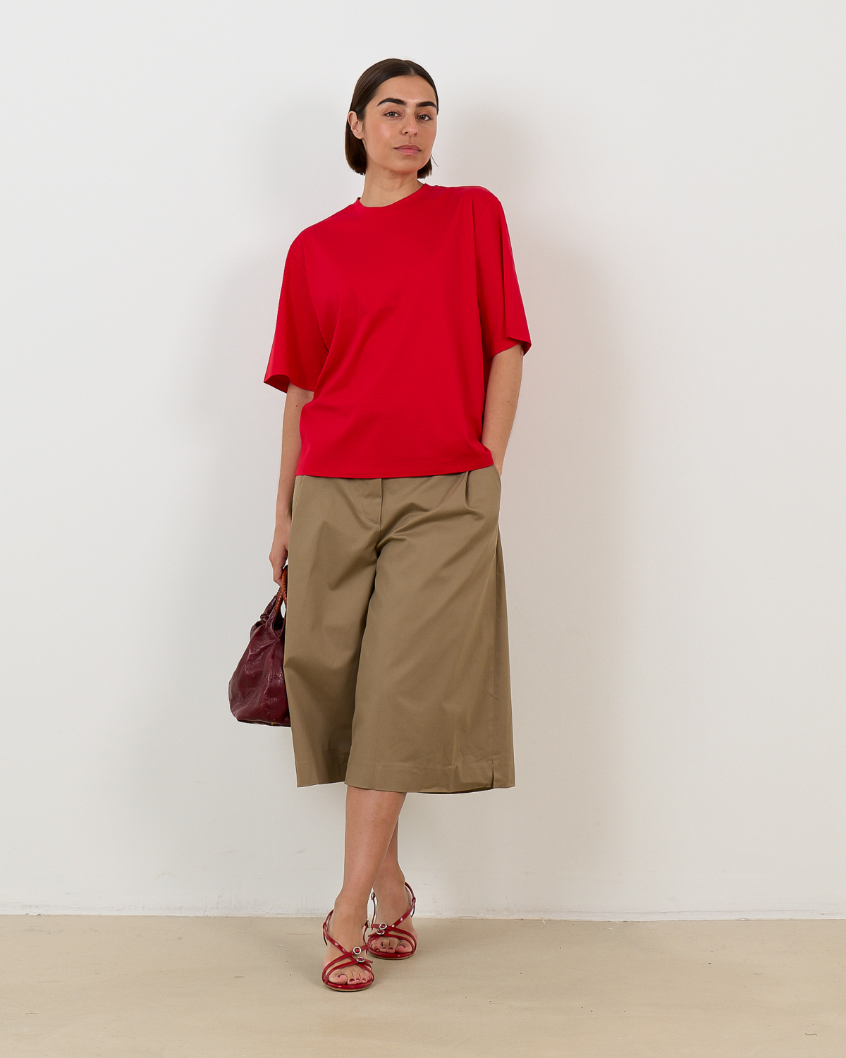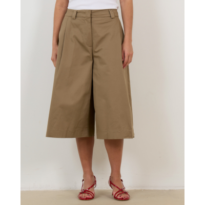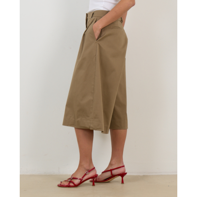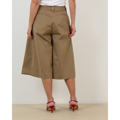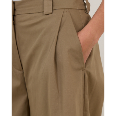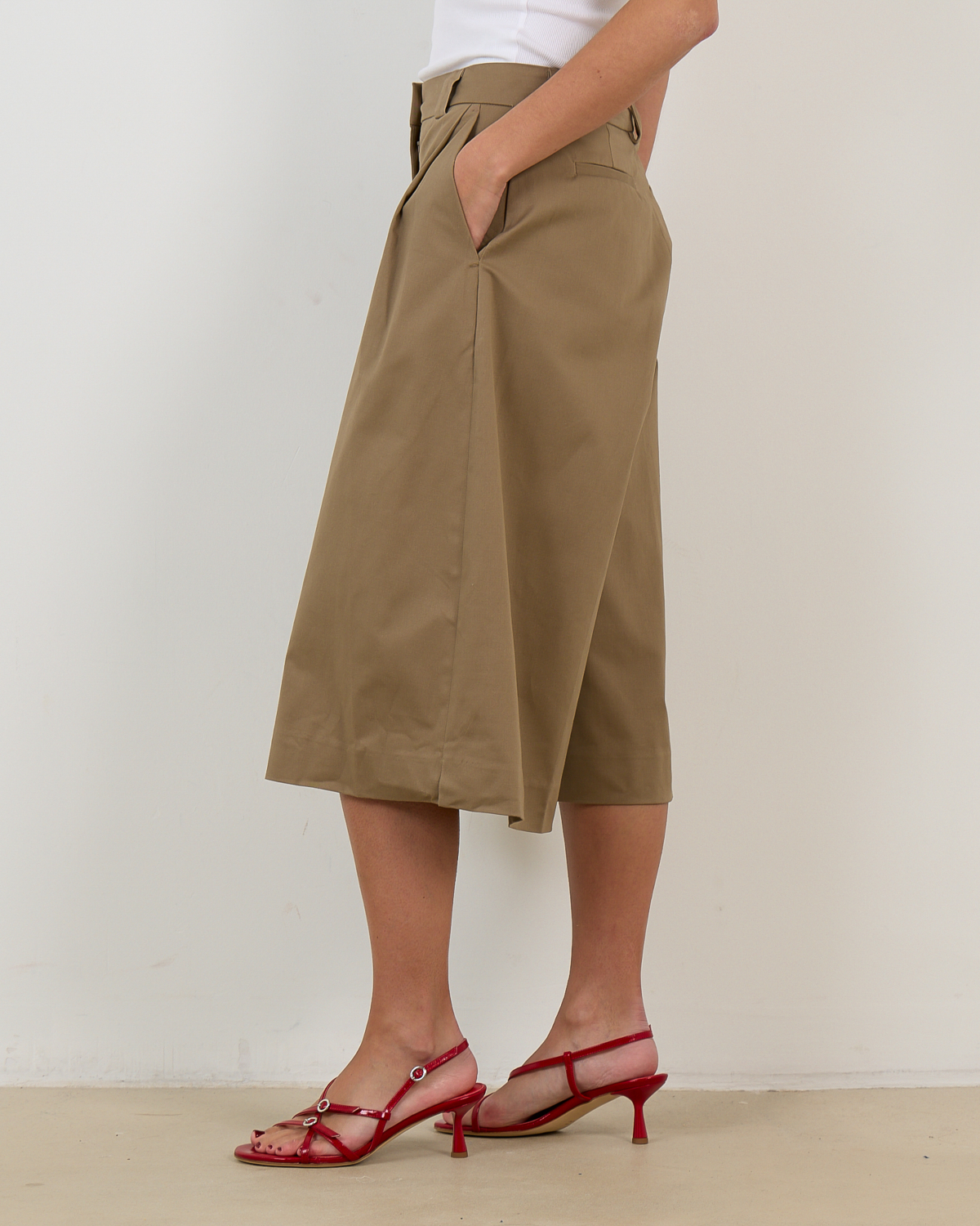Deze zandkleurige bermuda valt op door zijn verfijnde culotte-achtige silhouet. De wijde, uitlopende pijpen eindigen net onder de knie en creëren een elegant en eigentijds silhouet. De klassieke tailleband met riemlussen en knoopsluiting zorgt voor een mooie pasvorm. Het zachte katoenmengsel van 97% katoen en 3% elastaan biedt optimaal draagcomfort met een subtiele stretch. De regular fit en praktische steekzakken maken dit een veelzijdig stuk van The Latest.