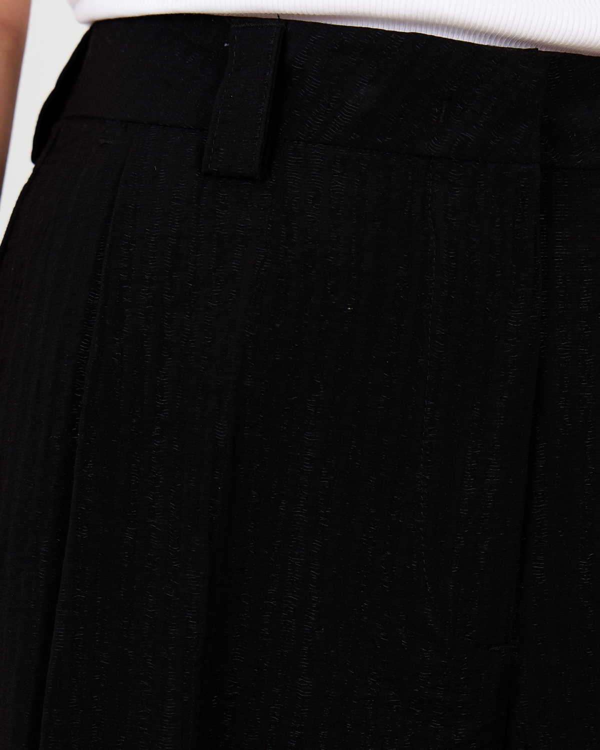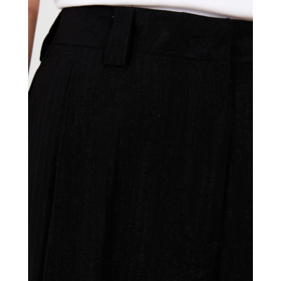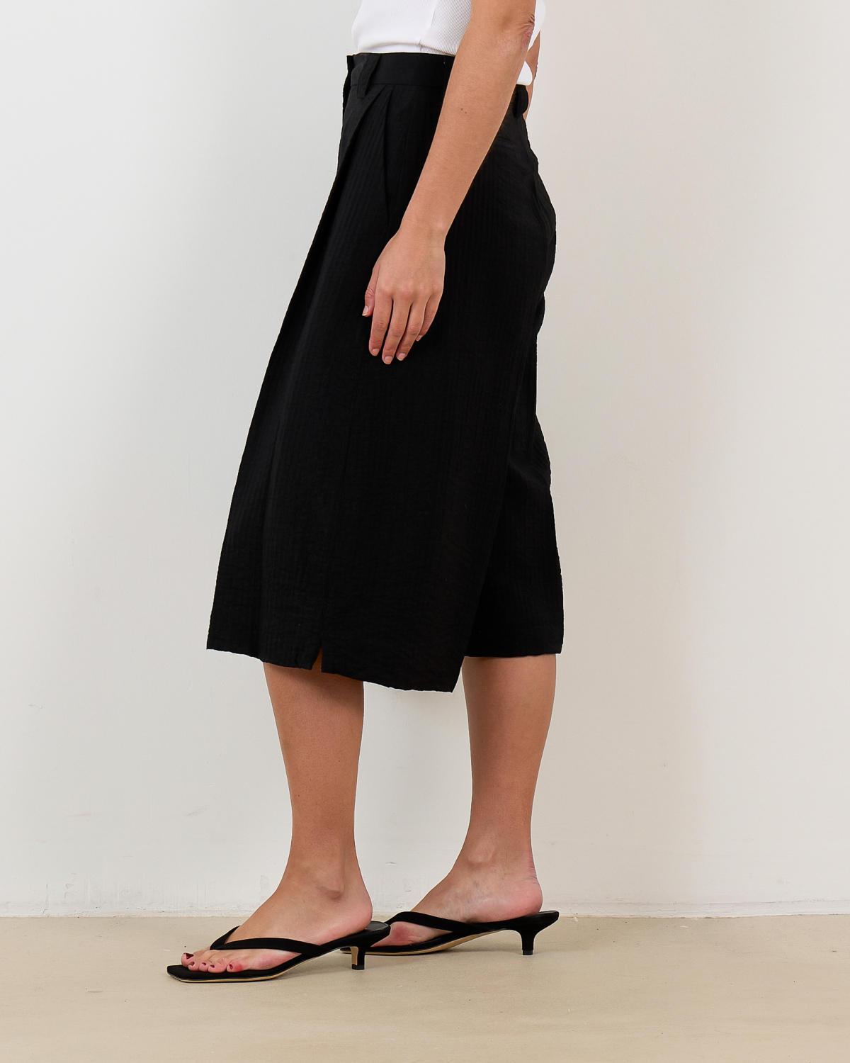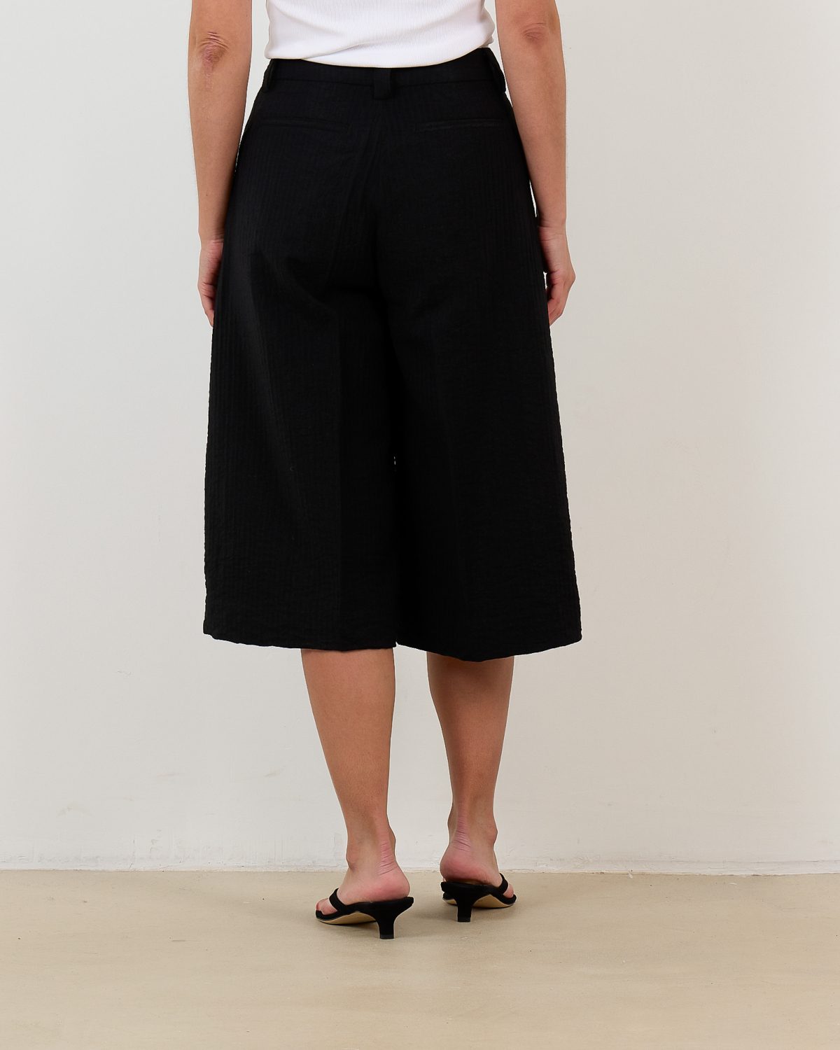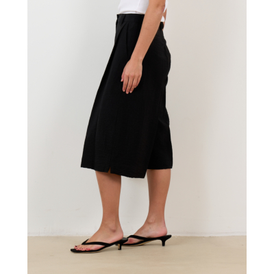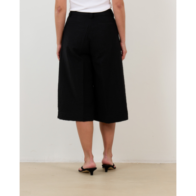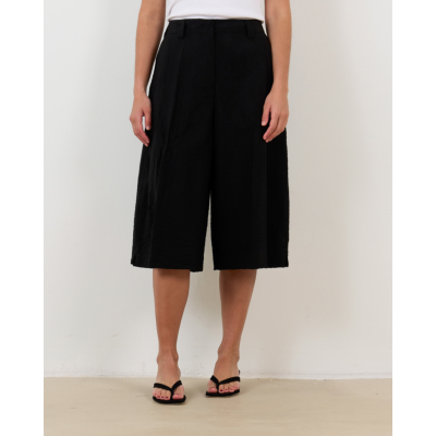 Deze elegante zwarte bermuda short valt tot net onder de knie en heeft een wijde, moderne silhouet. De luxueuze viscose-polyamidemix (81% viscose, 1% polyamide) zorgt voor een soepele val en draagcomfort. De regular fit en stijlvolle snit maken dit item perfect voor warme dagen waarbij je toch verfijnd wilt ogen.