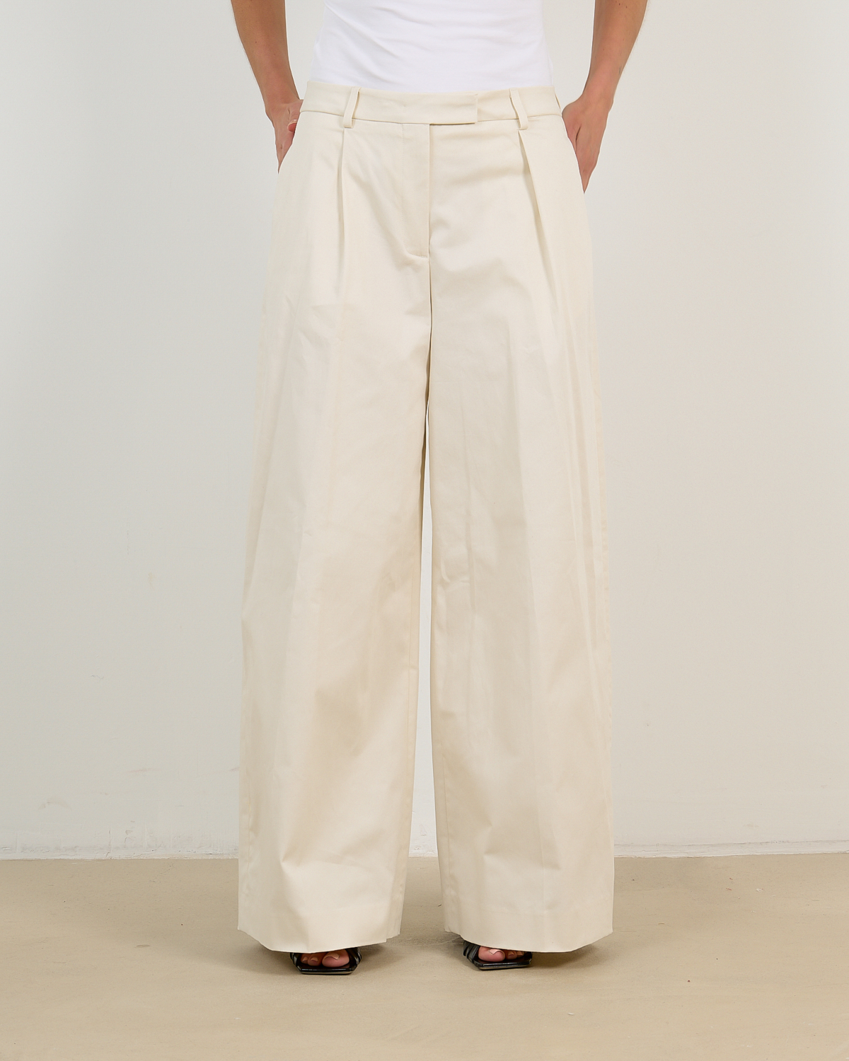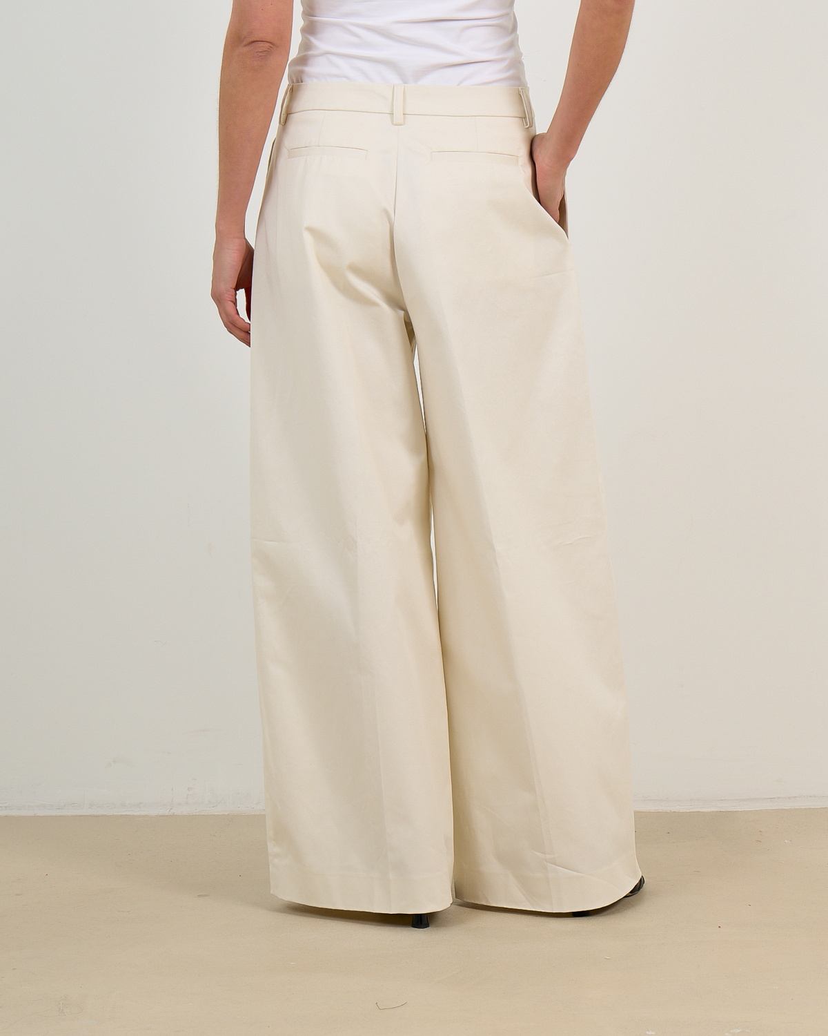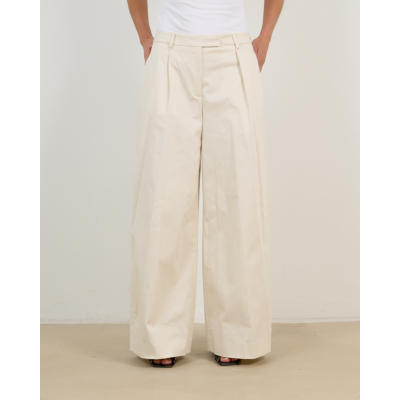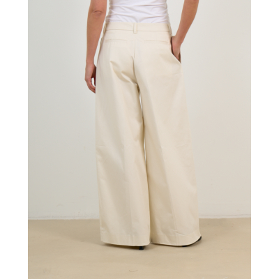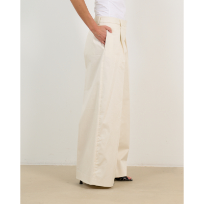 Deze elegante gabardine pantalon in ecru straalt moderne verfijning uit. Het zachte katoenmengsel met 97% katoen en 3% elastaan zorgt voor optimaal draagcomfort. De low waist vormgeving en wijde pijpen creëren een tijdloze silhouet, terwijl de regular fit perfect aansluit. Opvallende details zijn de geplooid front, steekzakken aan de voorzijde en achterzakken met klepje. De katoenen gabardine stof geeft deze pantalon een luxueuze uitstraling.