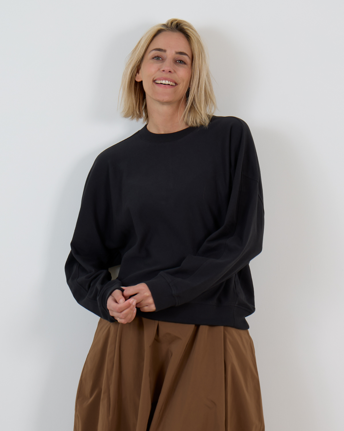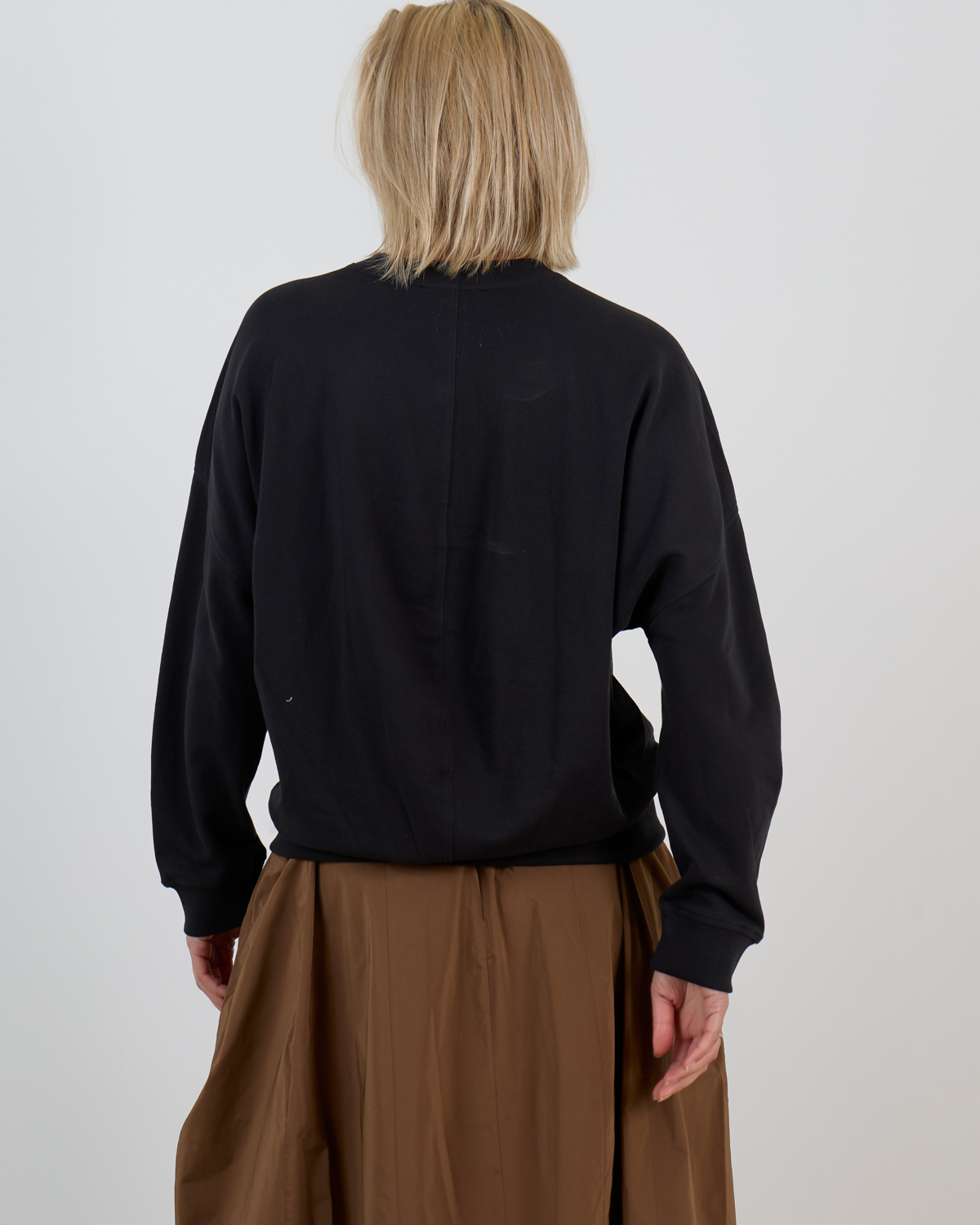 Deze zwarte sweatshirt van 100% katoen straalt moderne elegantie uit met zijn stijlvolle oversized fit. De ronde halslijn en lange mouwen zorgen voor een tijdloze uitstraling, terwijl het lichtgewicht materiaal optimaal comfort biedt. Het minimalistische design in diep zwart maakt dit een veelzijdig basisstuk dat perfect aansluit bij de hedendaagse garderobe.