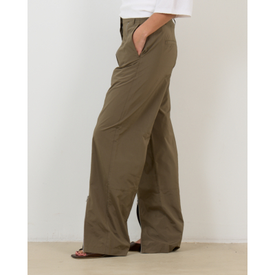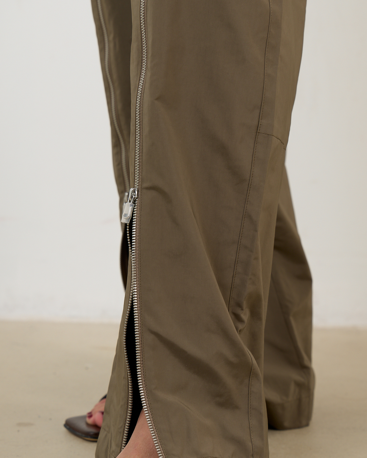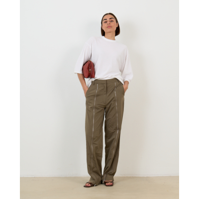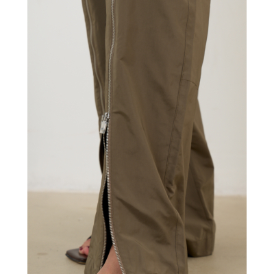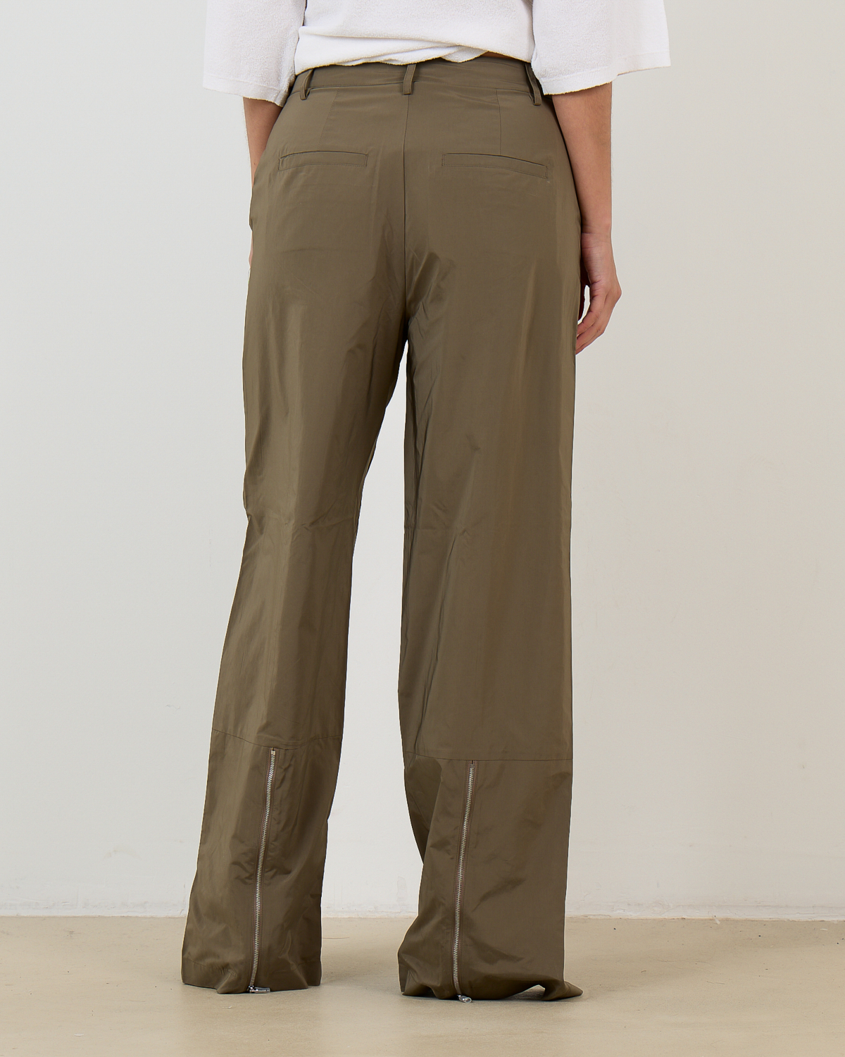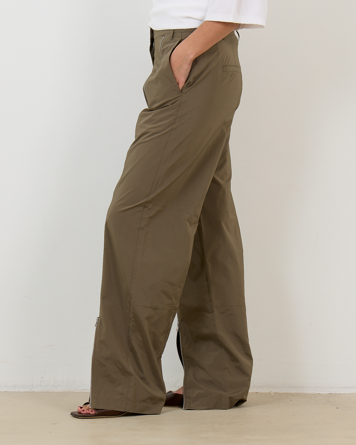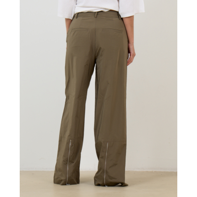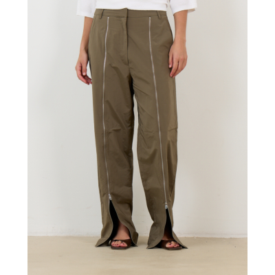 Deze statement broek in warme taupe toont een moderne twist op klassieke tailoring. Vervaardigd uit een hoogwaardige polyester-polyamide mix (83% polyester, 17% polyamide) met opvallende zilveren ritssluitingen aan de voorkant en onderkant van beide pijpen. De relaxed fit zorgt voor comfort, terwijl de rechte pijpen en hoge taille een elegante silhouet creëren. Steekzakken aan beide zijden bieden praktische functionaliteit.