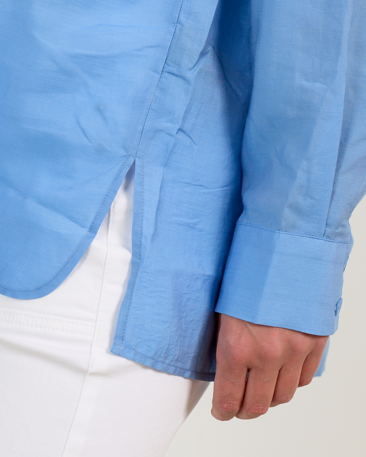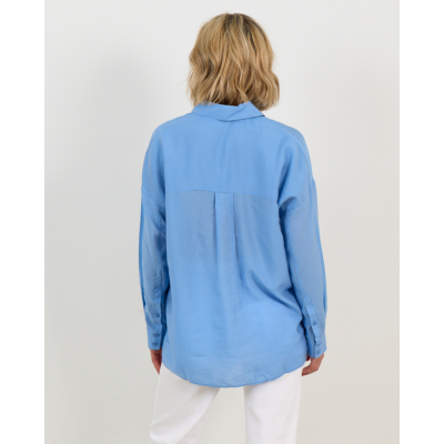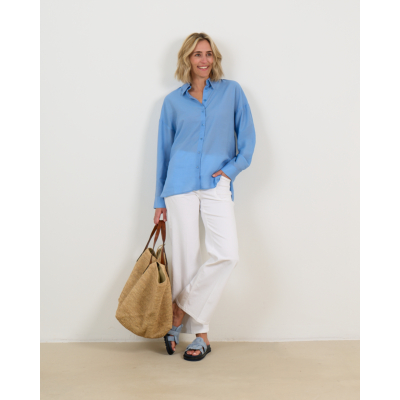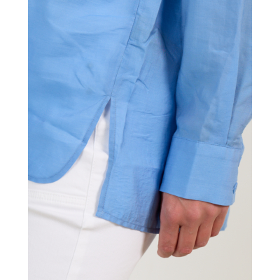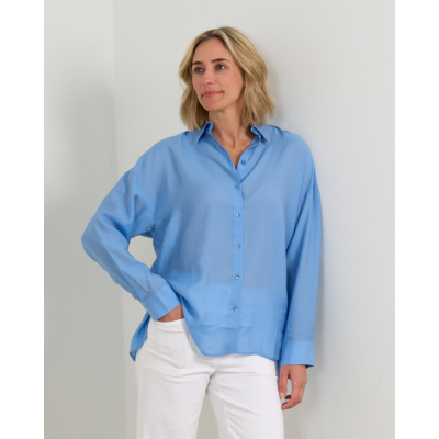 Deze lichtblauwe oversized blouse van lyocell en zijde zorgt voor een elegante en moderne look. De luxueuze materiaalmix van 84% lyocell en 16% zijde geeft een zachte en luchtige draagervaring. Met klassieke knoopsluiting, borstzak en lange mouwen met manchetten straalt deze blouse verfijnde nonchalance uit. De oversized pasvorm biedt bewegingsvrijheid en een eigentijdse silhouet.