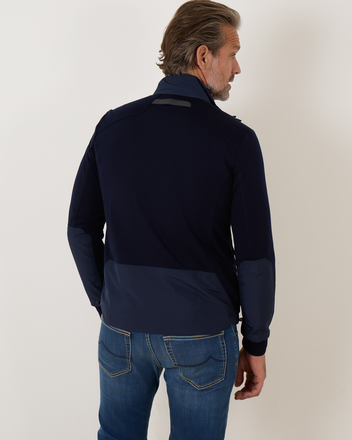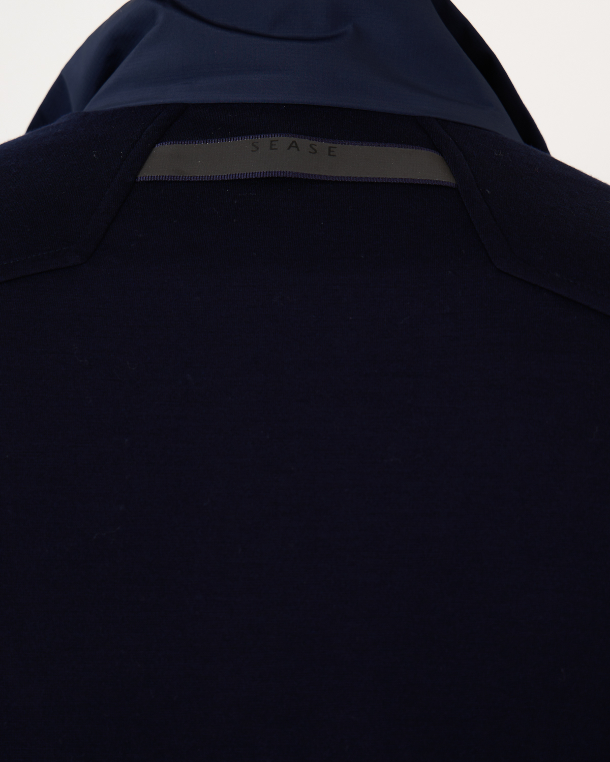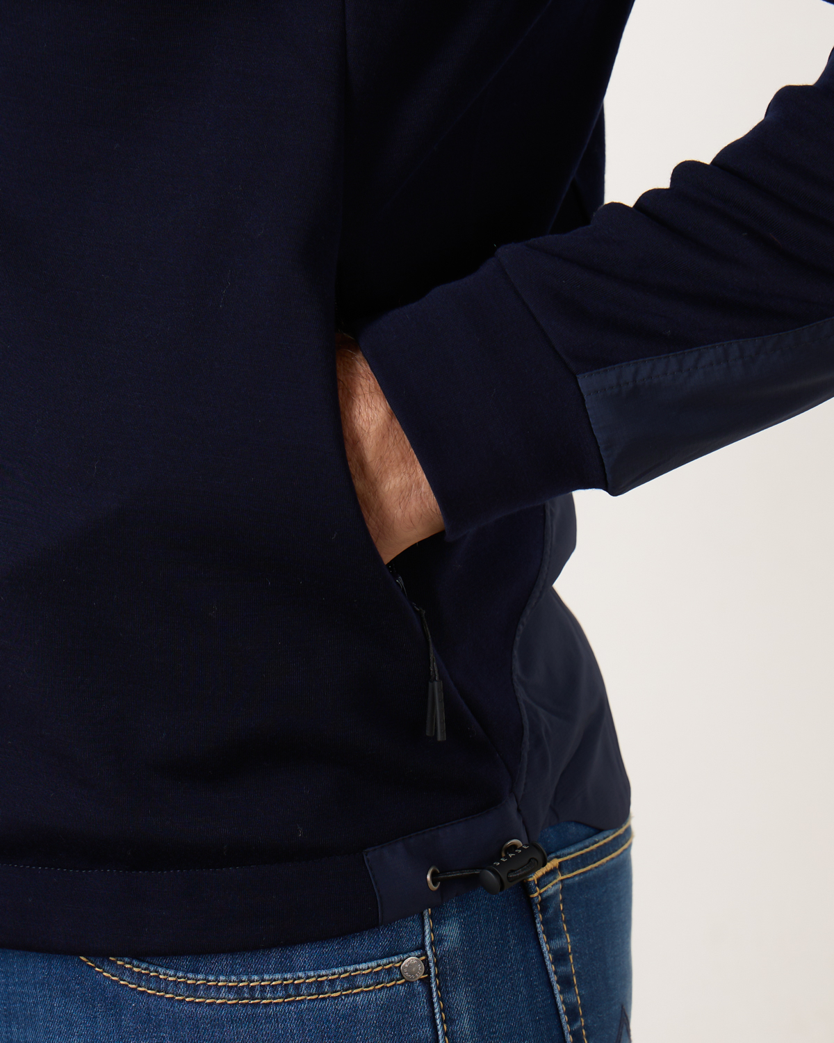 De Explorer Sweatshirt in navy blauw is een full‑zip sweater met een sportieve, avontuurlijke uitstraling, vervaardigd in Italië. De buitenlaag combineert zacht virgin wol met duurzaam nylon‑jersey, versterkt door ripstop‑panelen van gerecycled polyester voor extra slijtvastheid. De hoge kraag biedt extra warmte, terwijl de onzichtbare ritszakken en verstelbare trekkoordzoom zorgen voor praktische functionaliteit en een strakke pasvorm