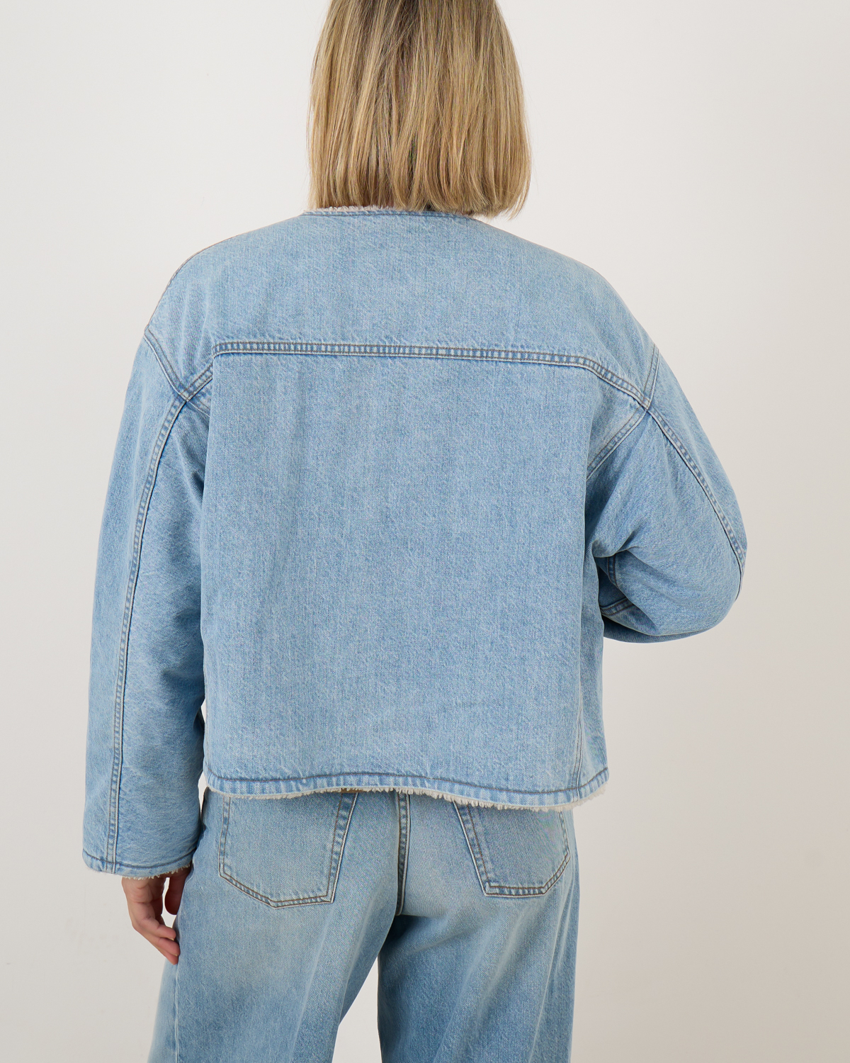 De Lucien Jacket van Xirena combineert denim met fleece. De jacket zonder kraag is aan de buitenzijde uitgevoerd in lichtblauw denim en afgewerkt met zilveren knopen. Aan de binnenkant is de jacket voorzien een heerlijke comfortabele voering.